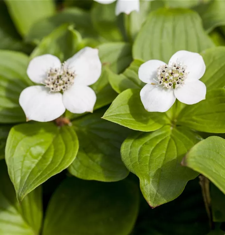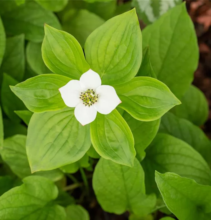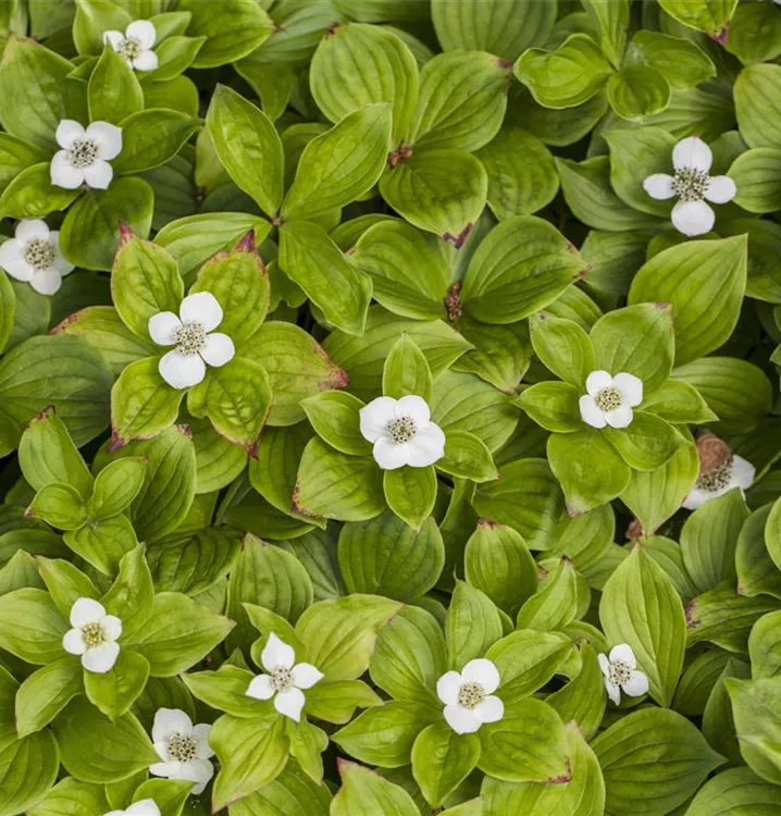 Der Teppich-Hartriegel (Cornus canadensis) ist ein teppichartiger Halbstrauch mit dekorativen, roten, runden Früchten. Die Blüten erscheinen je nach Sorte in verschiedenen Farben.