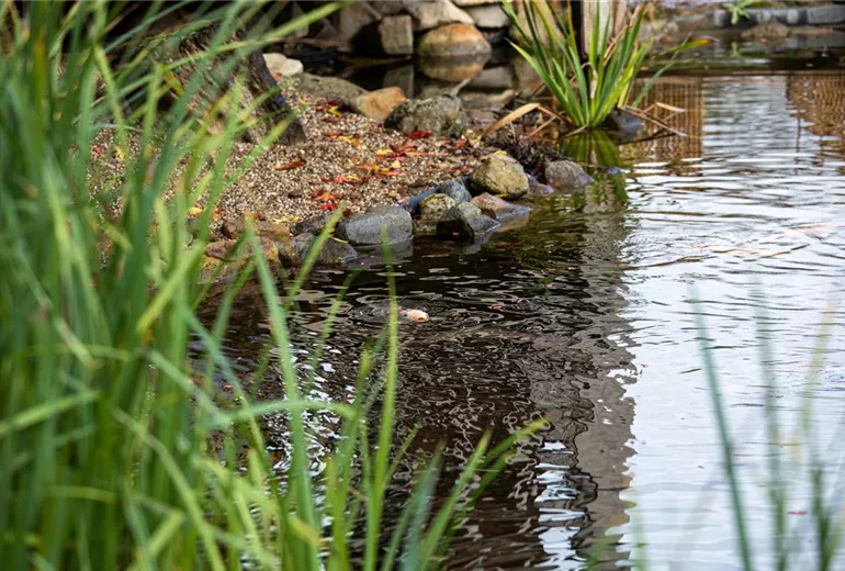Ein solcher Teich kann zum Teil durch einen breiten Kiesstreifen sowie durch ein bewachsenes Ufer gesäumt werden. Ein Weg über den Teich aus Trittstufen oder einem Steg führt zum Pavillon am anderen Ufer, der im Stil eines Teehauses gestaltet ist. Eine Rasenfläche kann in Form einer kleinen Hügellandschaft angelegt werden. Eine gute Kombination sind Buchsbaumkugeln, aber auch eine imposant blühende Magnolie. Der Garten sollte nach außen hin durch höher wachsende Pflanzen abgegrenzt werden, um das Gefühl einer Oase der Ruhe zu verstärken. Dazu würden sich neben hohen Sträuchern auch Bambus eignen. Dazwischen dürfen dekorative Elemente wie eine Buddha-Figur oder ein Wassertrog aus Stein nicht fehlen.