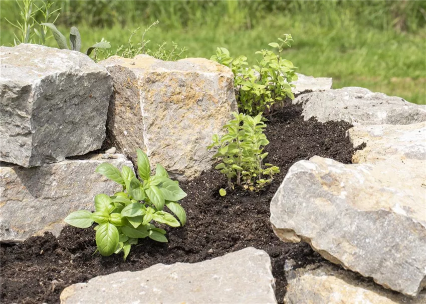 Eine Kräuterspirale lässt sich in vier Zonen aufteilen. Die unterste Zone ist für Kräuter geeignet, die es feucht mögen und auch einmal nasse Füße vertragen können. In diese Zone sollte man eine Mischung aus 50 Prozent Gartenerde und 50 Prozent Kompost ausbringen. Hier fühlen sich Brunnenkresse und Wasserminze wohl. Die zweite Zone ist ebenfalls eine eher feuchte Zone, deren Substrat aus 50 Prozent Gartenerde, 20 Prozent Sand und 30 Prozent Kompost bestehen sollte. Sie ist ideal für Pflanzen wie Bärlauch, Estragon, Basilikum, Dill, Melisse, Petersilie und Liebstöckel. In der dritten Zone gedeihen die meisten Minzarten, Schnittlauch, Koriander, Kapuzinerkresse, Borretsch und ähnliche Kräuter am besten. Sie sollte mit einem Gemisch aus 50 Prozent Gartenerde, 30 Prozent Sand und 20 Prozent Kompost aufgefüllt werden. Der obere Bereich ist den mediterranen Kräutern vorbehalten, die es warm und trocken mögen. In der Erde aus 50 Prozent Gartenerde und 50 Prozent Sand gedeihen Currykraut, Lavendel, Oregano, Thymian, Rosmarin, die meisten Salbeiarten, Majoran, Lorbeer und weitere mediterrane Kräuter bestens.