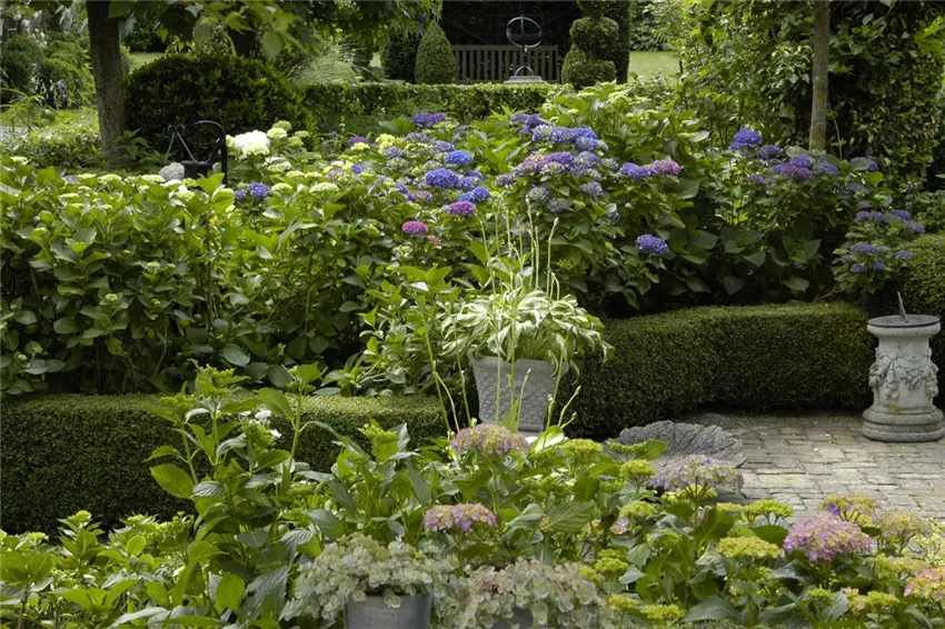 Gartengestaltung mit Pflanzgefäßen in verschiedenen Gärten