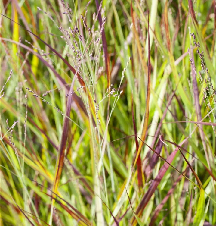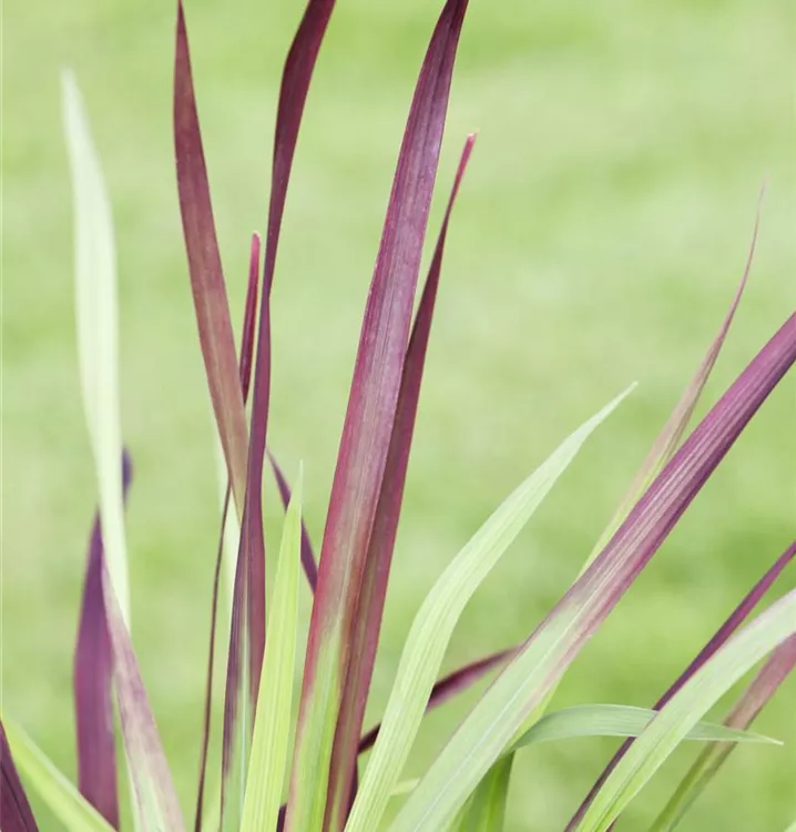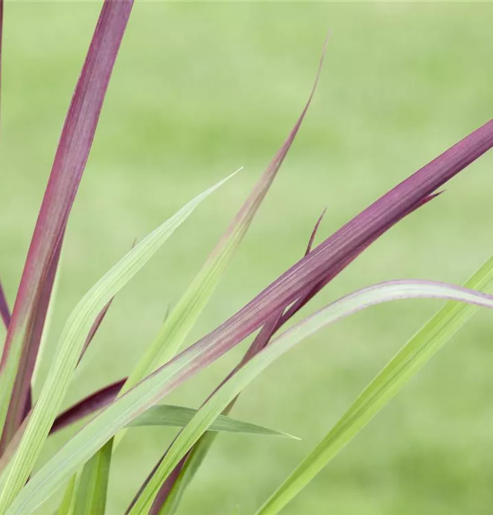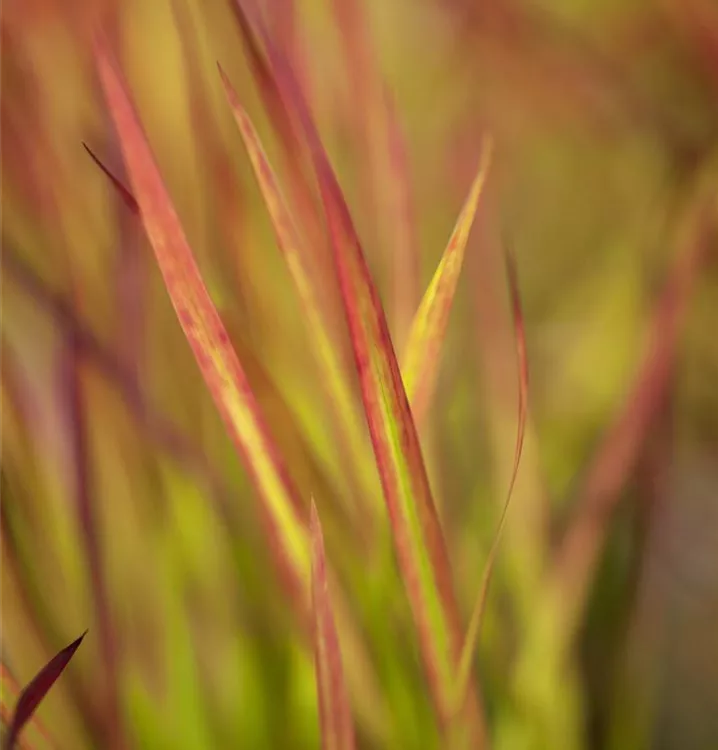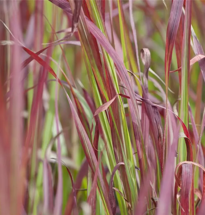 Die sommergrünen Blätter des Garten-Blutgrases 'Red Baron' sind grün-rot, lineal. Garten-Blutgras 'Red Baron' zeigt sich leuchtend rot im Herbst.