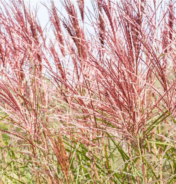 Die dunkelroten Blüten des Garten-Chinaschilf 'Brazil' erscheinen in Rispen von September bis November.