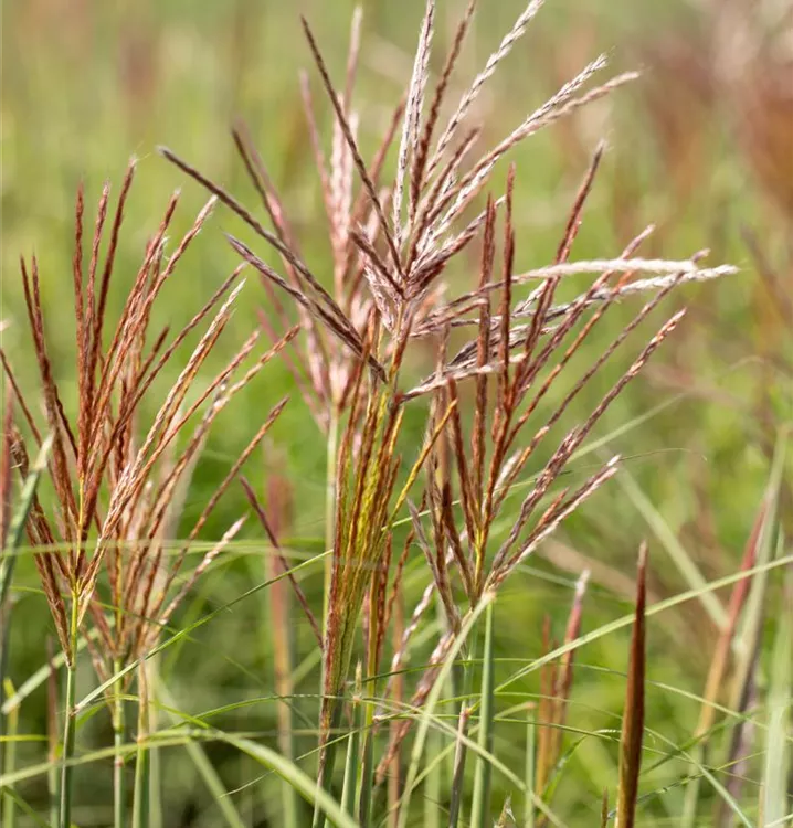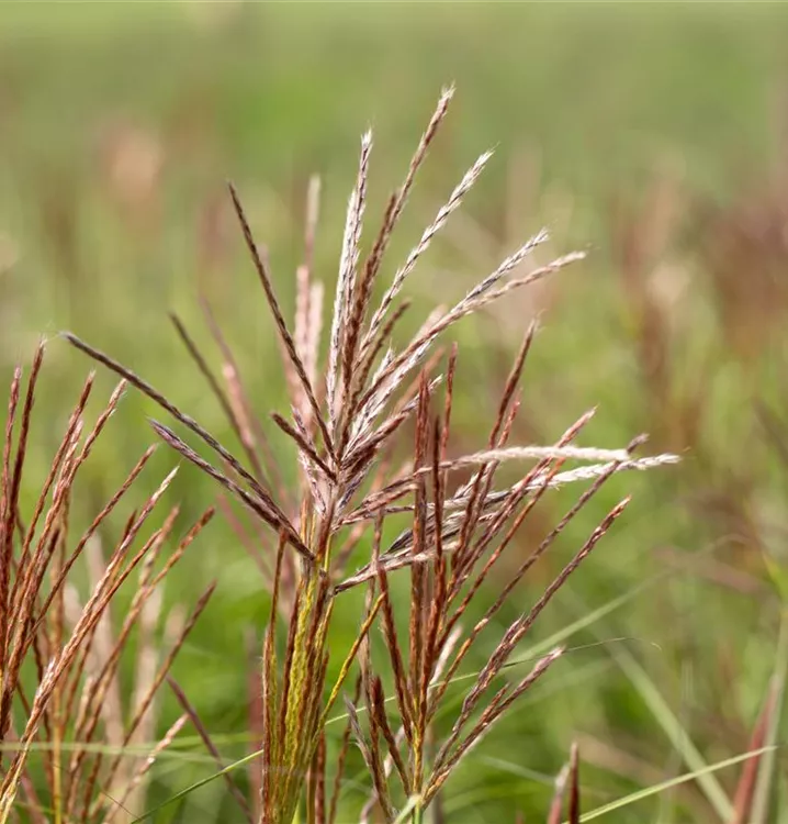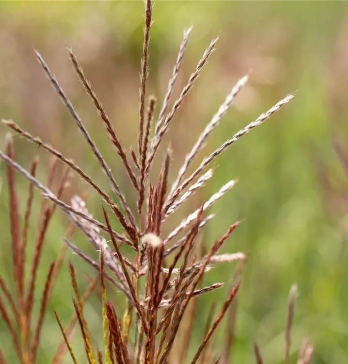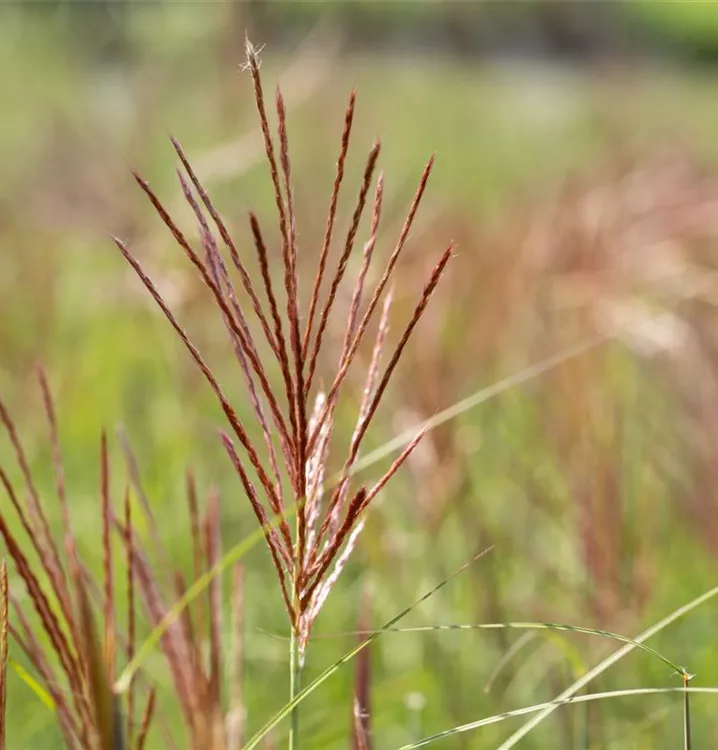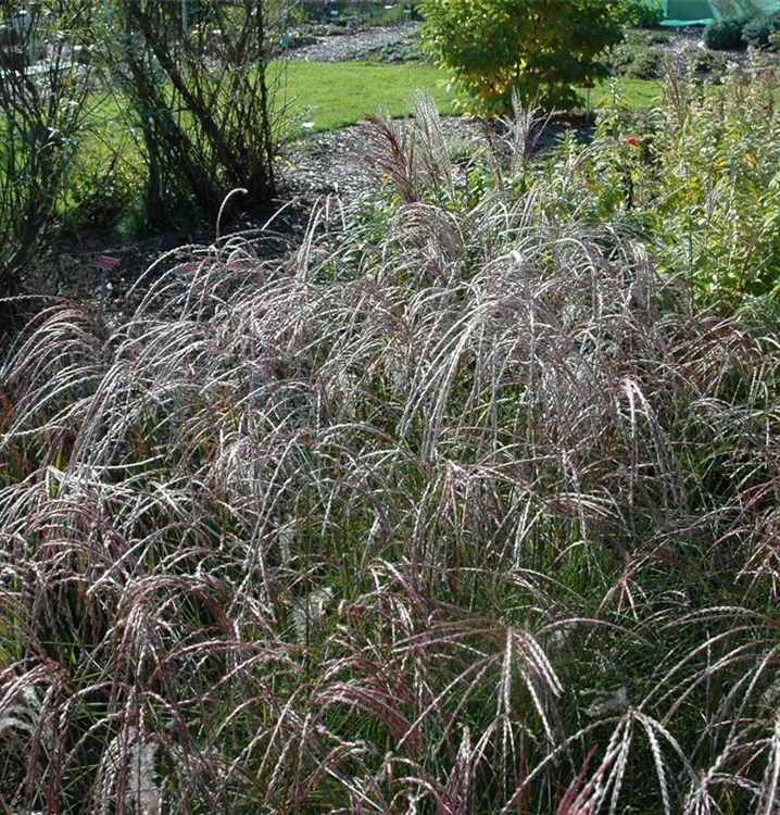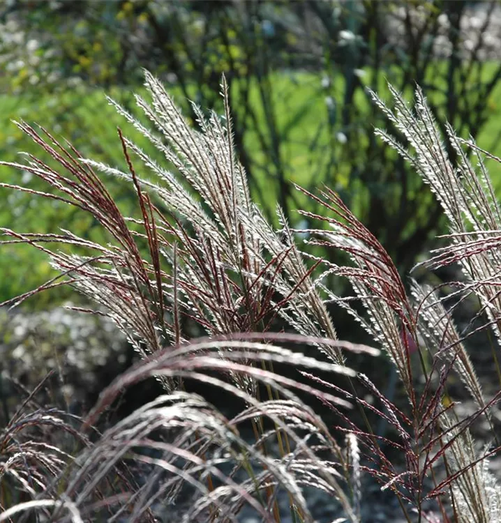 Das Garten-Chinaschilf 'Ferner Osten' (Miscanthus sinensis) ist mit seiner mittelgrünen Blattfärbung ein dekoratives Gestaltungselement im Garten, welches sich an einem sonnigen bis halbschattigen Standort mit einem möglichst durchlässigen, humosen, nährstoffreichen Boden am wohlsten fühlt. Die rot-weißen Blütenwedel schmücken die ausladend und horstbildend wachsende Pflanze ab Sommer. Bei günstigen Bedingungen erreicht dieses winterharte Gras eine Höhe von ca. 1,2 m und wird bis zu 80 cm breit.