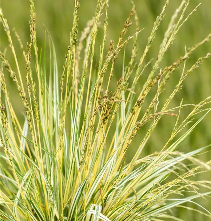 Das Gestreifte Garten-Pfeifengras 'Variegata' (Molinia caerulea) ist mit seiner gelb-grünen Blattfärbung ein dekoratives Gestaltungselement im Garten, welches sich an einem sonnigen bis halbschattigen Standort mit einem möglichst durchlässigen, kalkfreien Boden am wohlsten fühlt. Die schwarzen Blütenwedel schmücken die horstbildend wachsende Pflanze ab Sommer. Bei günstigen Bedingungen erreicht dieses winterharte Gras eine Höhe von ca. 40 cm und wird bis zu 30 cm breit.