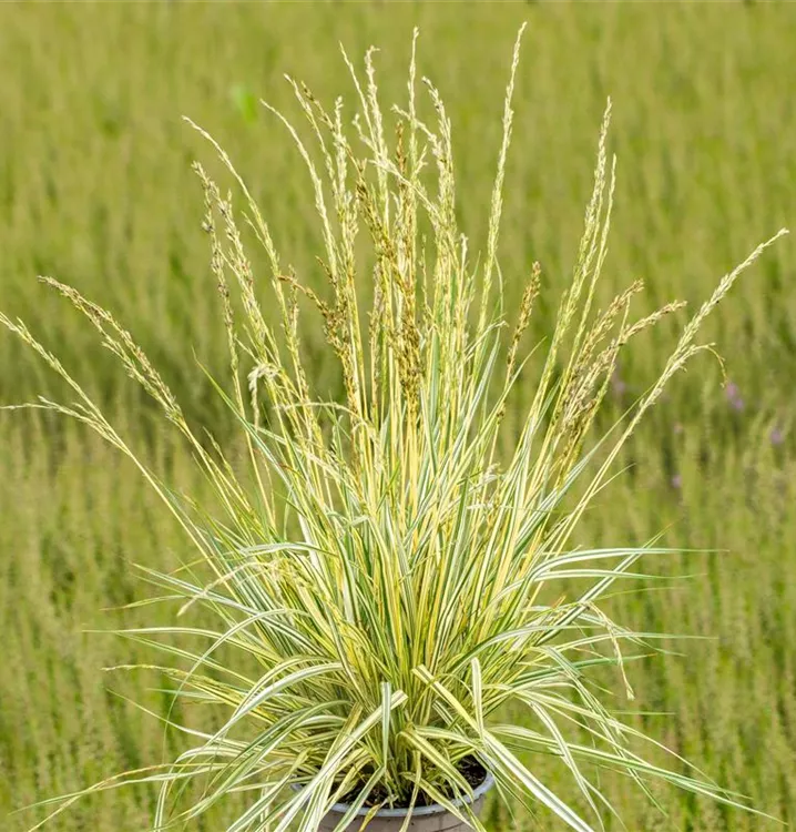 Hoher Blattschmuckwert. Die sommergrünen Blätter des Gestreiften Garten-Pfeifengrases 'Variegata' sind gelb-grün, lineal.