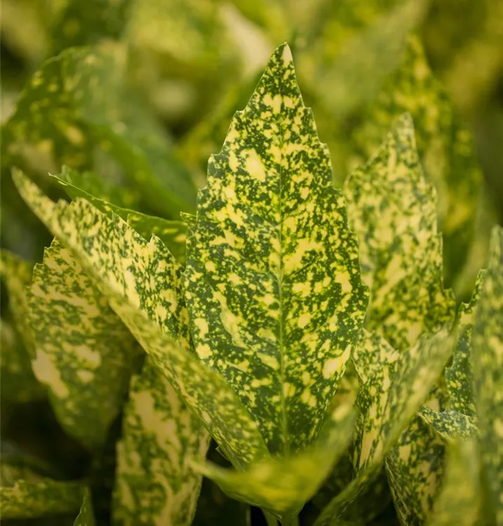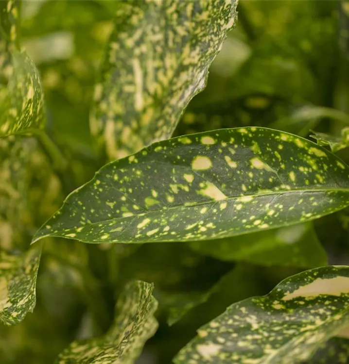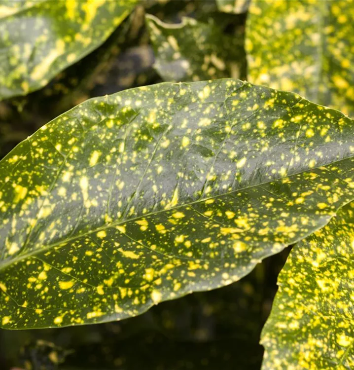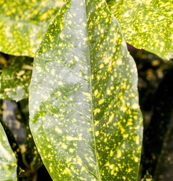 Hoher Blattschmuckwert. Die immergrünen Blätter der Japanische Aucube 'Variegata' sind gelb-grün, lanzettlich, glänzend, ledrig. Diese sind etwa 8 - 20 cm groß.