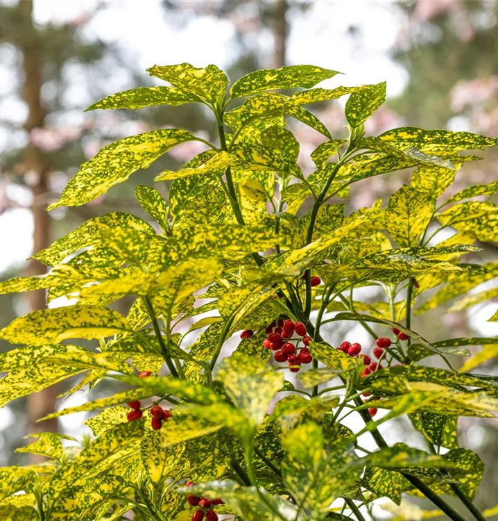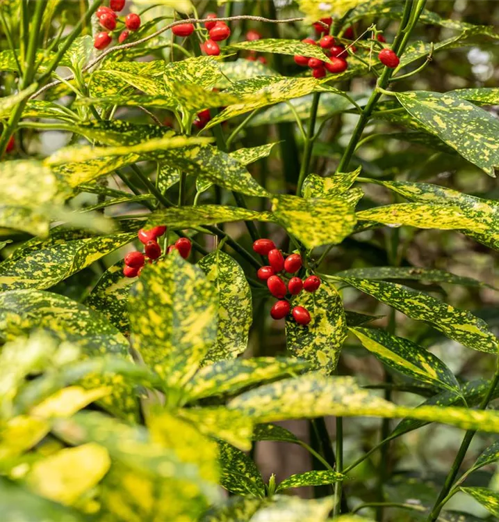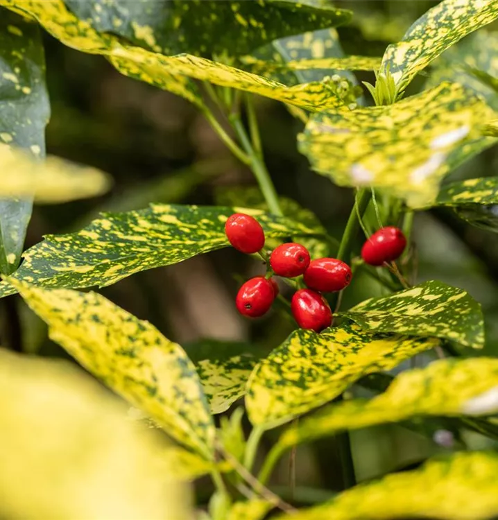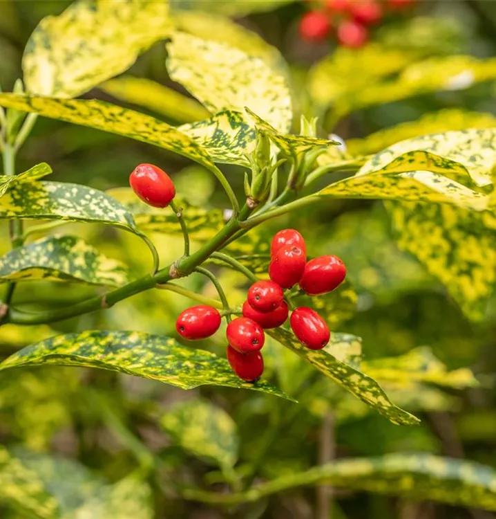 Besonders dekorativ sind die roten, ovalen Beeren von Aucuba japonica 'Variegata'. Diese erscheinen ab September und sind klein. Haften sehr lange.