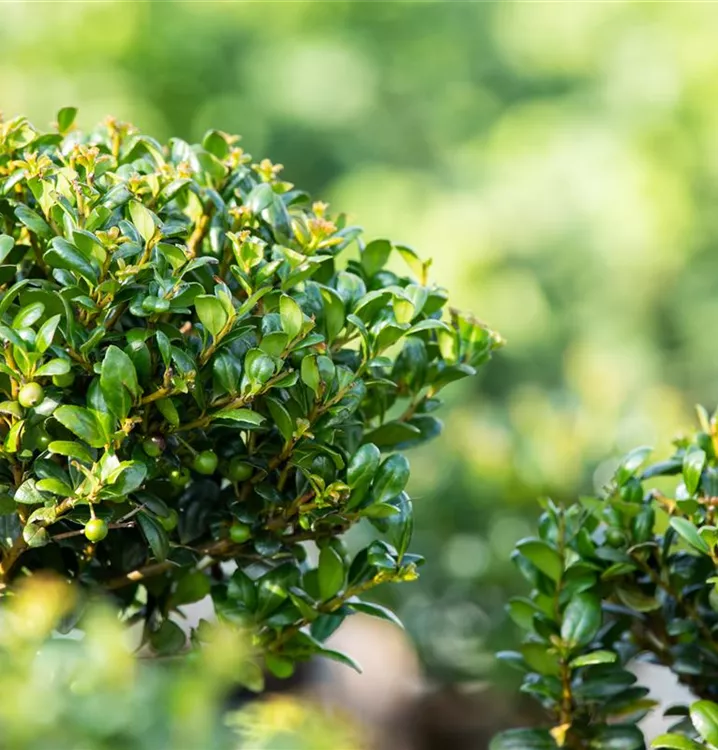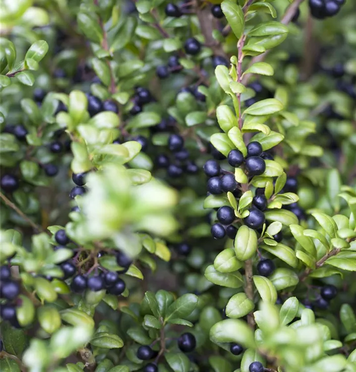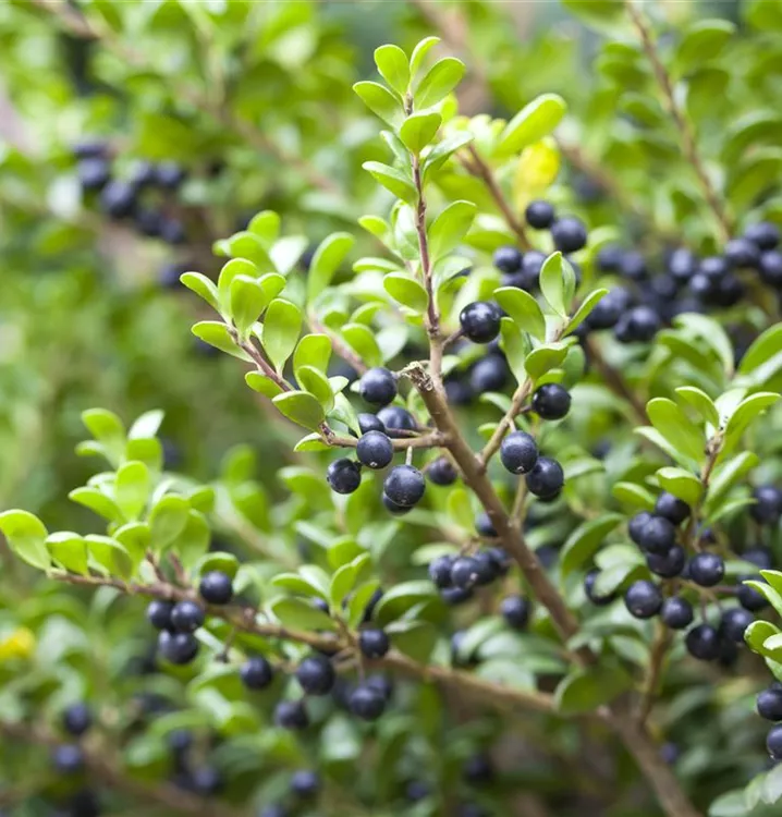 Besonders dekorativ sind die schwarzen, runden Früchte von Ilex crenata 'Convexa'. Diese erscheinen ab Oktober. Haften sehr lange.