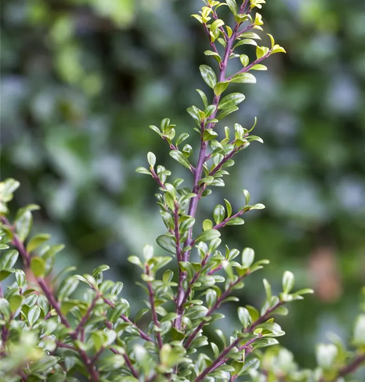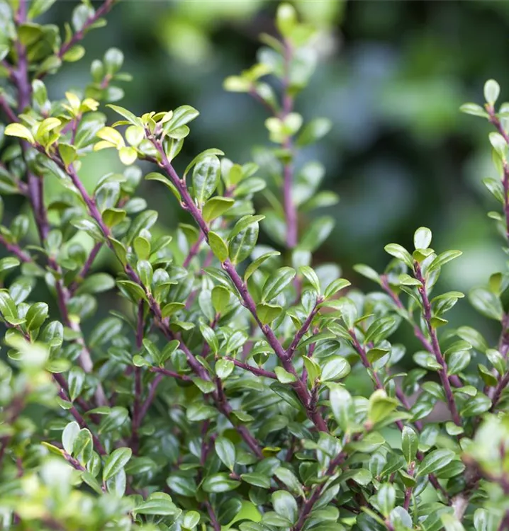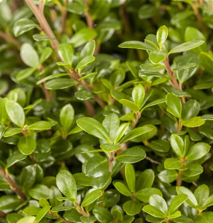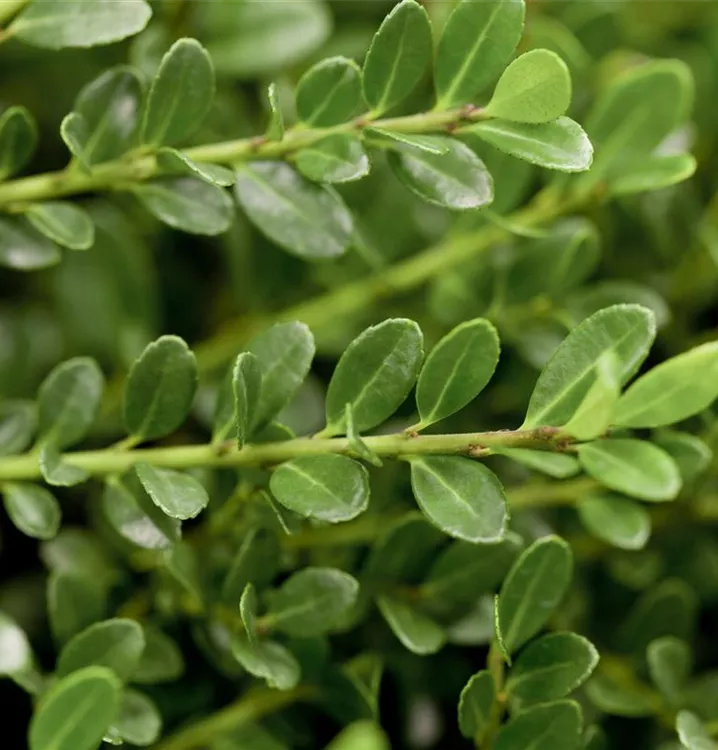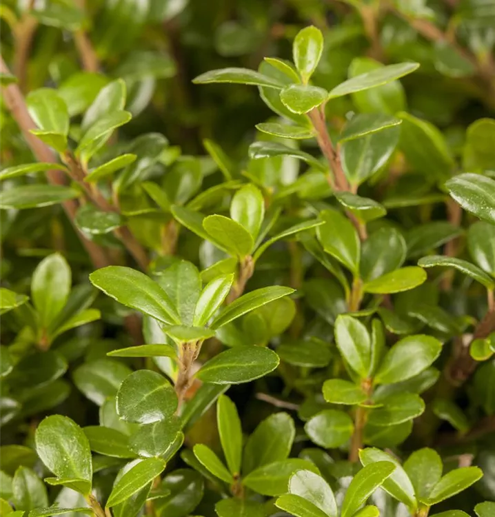 Die immergrünen Blätter des Berg-Ilexes 'Glorie Gem' sind dunkelgrün, rundlich, glänzend, wechselständig. Diese sind etwa 2 - 3 cm groß.