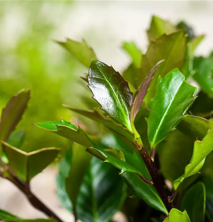 Die immergrünen Blätter der Stechpalme 'Heckenblau'®(s) sind dunkelgrün, lanzettlich. Purpurvioletter Austrieb.