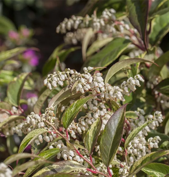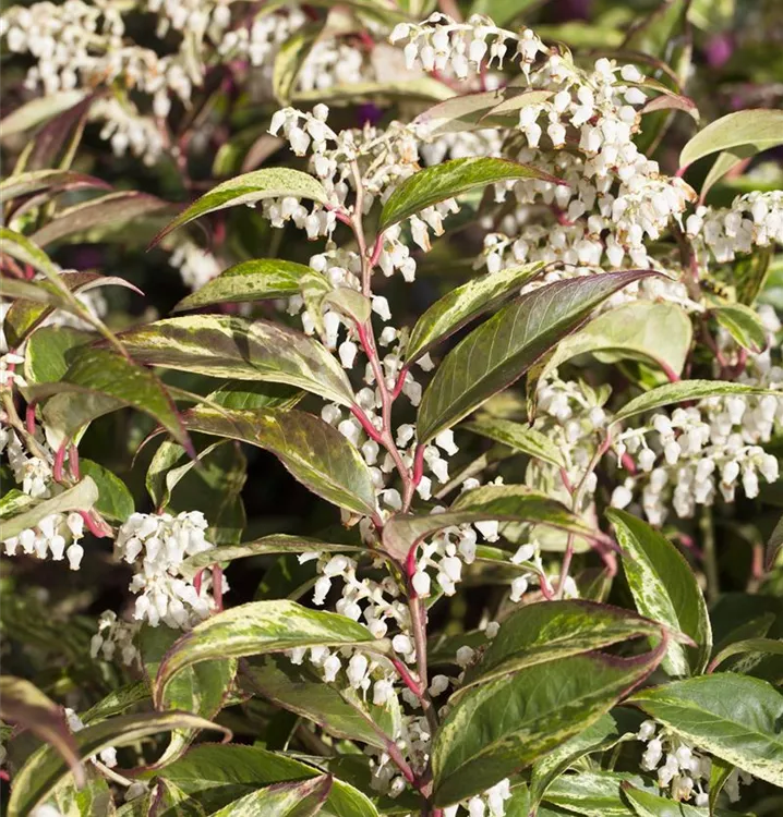 Die Traubenmyrte 'Rainbow' (Leucothoe walteri) ist ein ausladender, überhängender, Kleinstrauch mit dekorativen immergrünen, glänzenden, lanzettlichen, mehrfarbigen Blättern. Auch der rosa-rote Austrieb ist sehr schön.