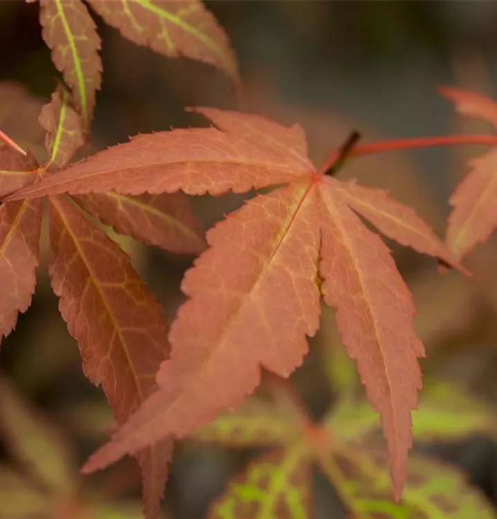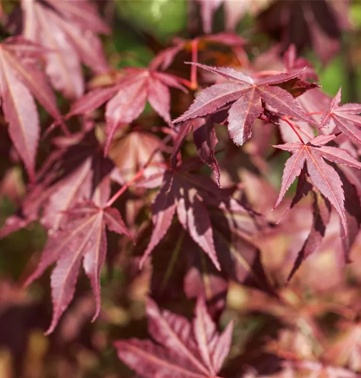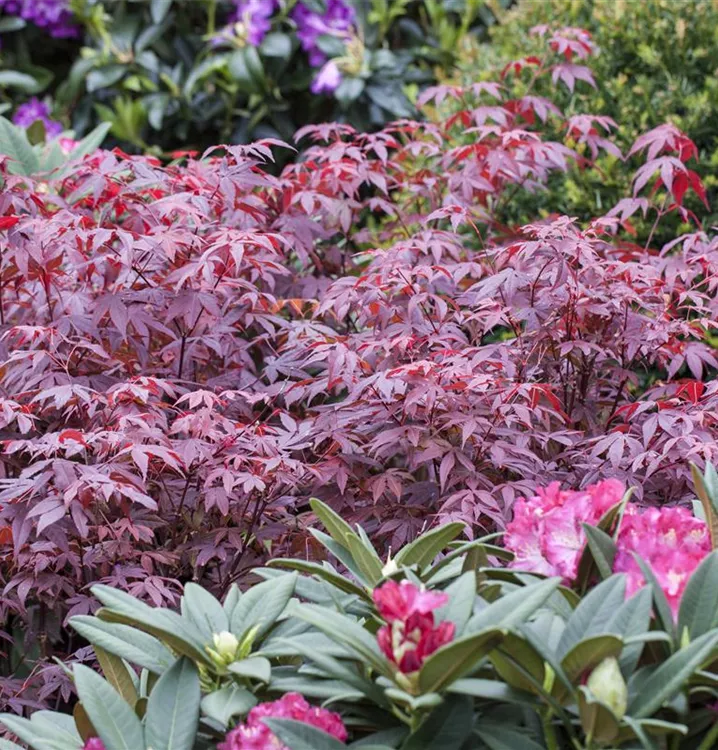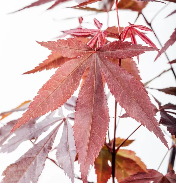 Der Rote Fächerahorn 'Atropurpureum' (Acer palmatum) ist ein ausladender, breiter, malerischer, Großstrauch mit dekorativen sommergrünen, tief geschlitzten, purpurroten Blättern.
