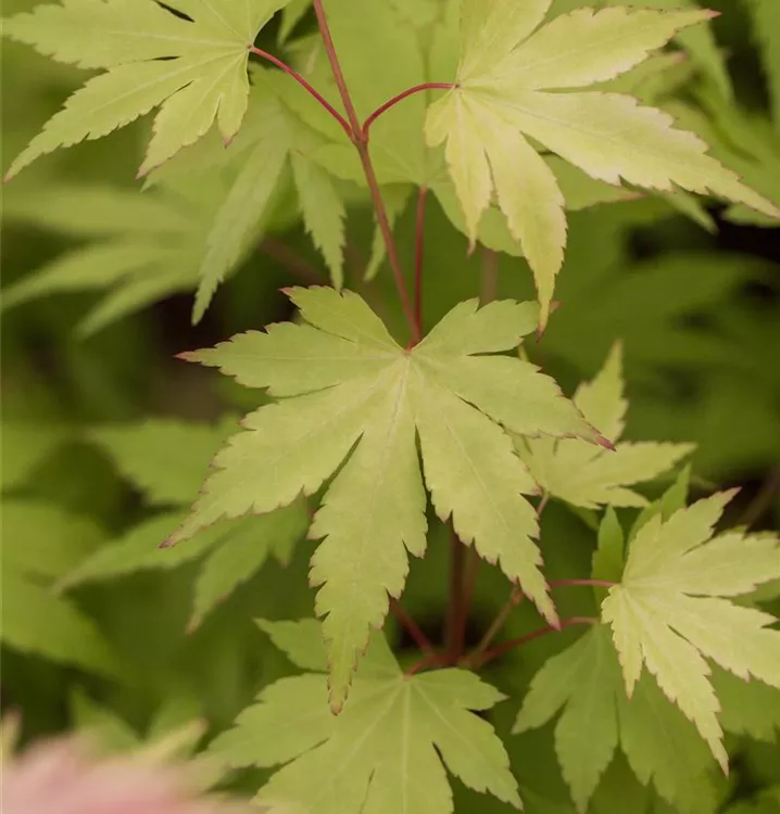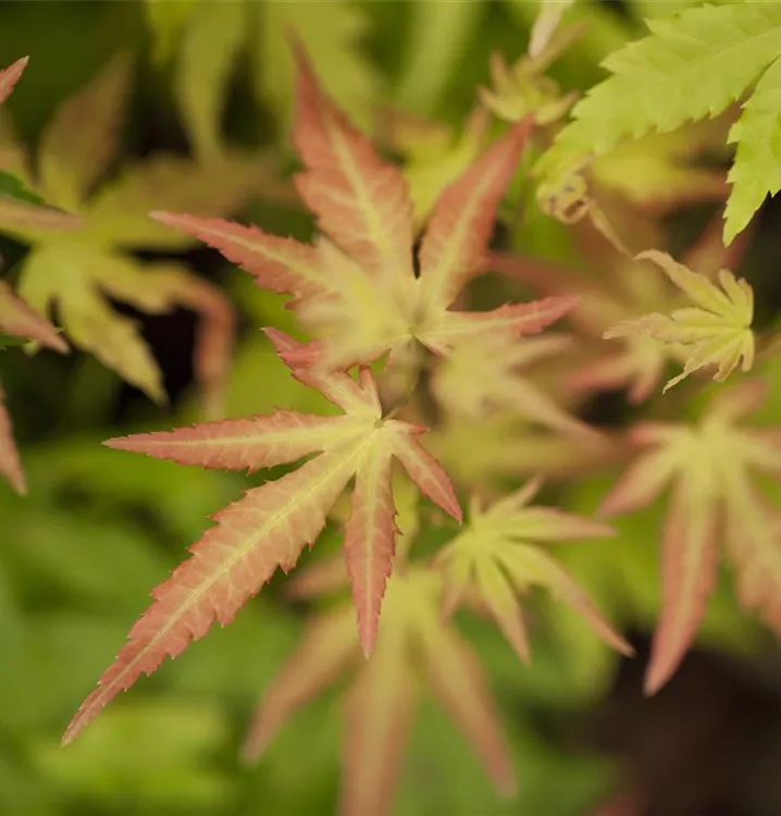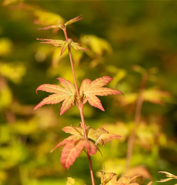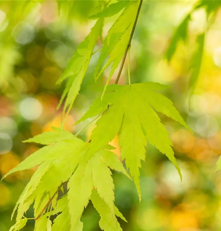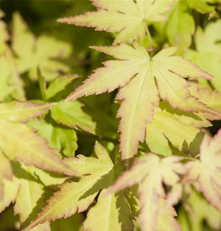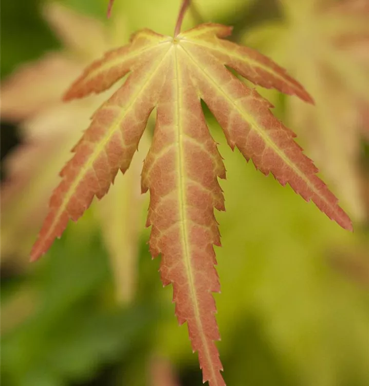 Hoher Blattschmuckwert. Die sommergrünen Blätter des Fächerahorns 'Orange Dream' sind grün, gegenständig, gelappt und weisen einen hellorangenen Rand auf. Diese sind etwa 8 - 10 cm groß. Orangefarbener, früher Austrieb. Fächerahorn 'Orange Dream' zeigt sich leuchtend goldgelb im Herbst.