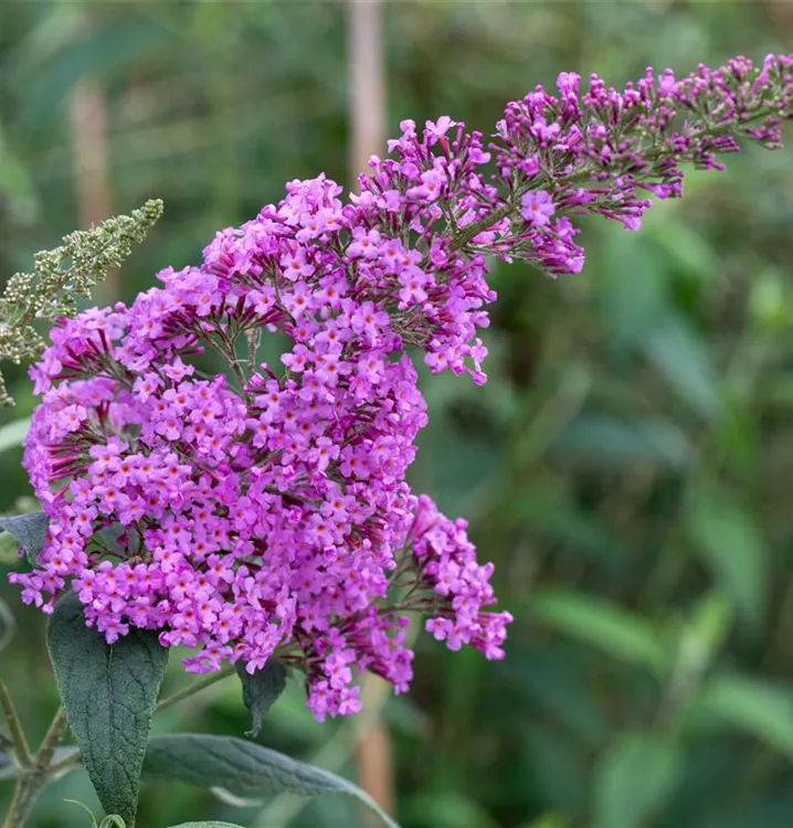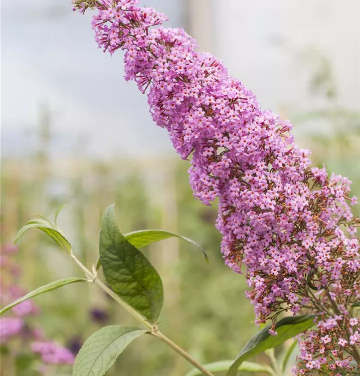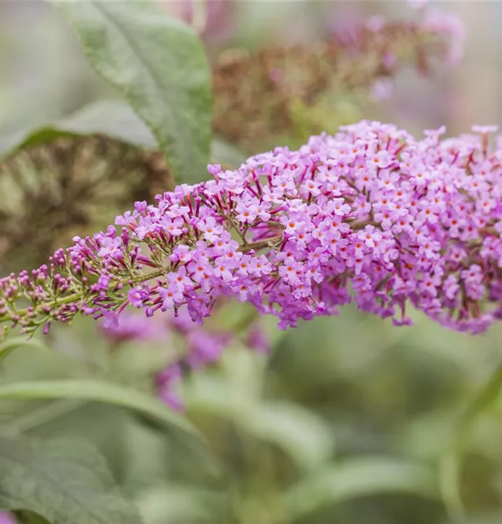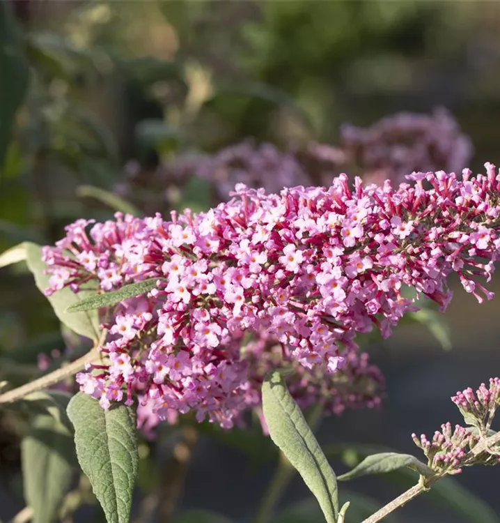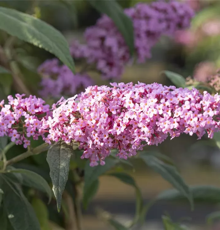 Die rosafarbenen Blüten des Sommerflieder 'Pink Delight' erscheinen in Rispen von Juli bis Oktober. Diese werden etwa 25 - 30 cm groß und sind stark duftend.