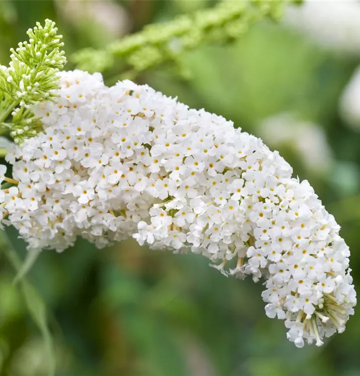 Die weißen Blüten des Sommerflieder 'White Profusion' erscheinen in Rispen von Juli bis September. Diese sind stark duftend.