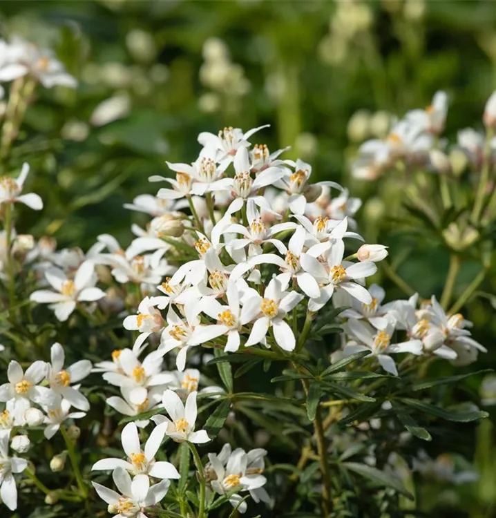 Choisya ternata 'Aztec Pearl' bildet während der gesamten Saison zahlreiche sternförmige, weiße Blüten. Diese verströmen einen starken Duft.