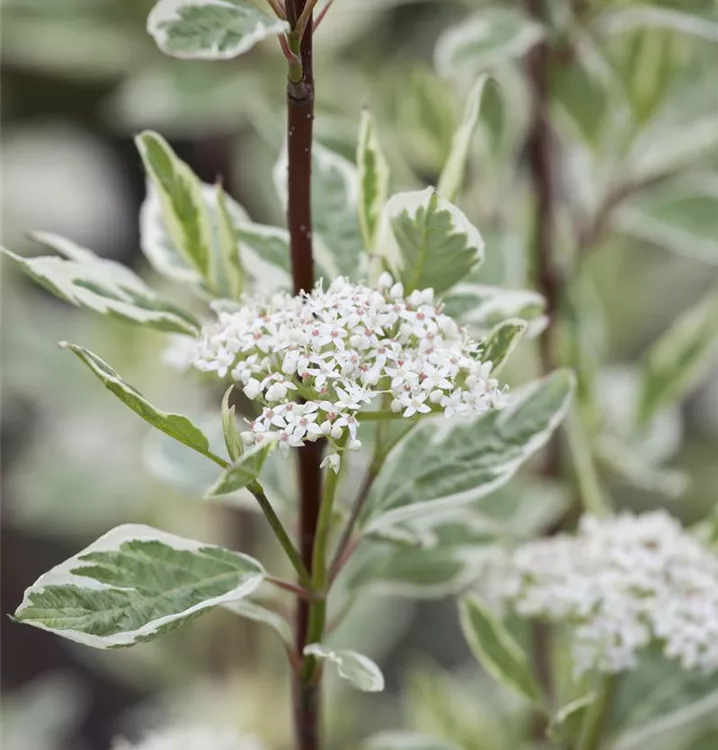 Die weißen Blüten des Hartriegel 'Elegantissima' erscheinen in Trugdolden von Mai bis Juni.