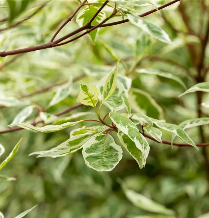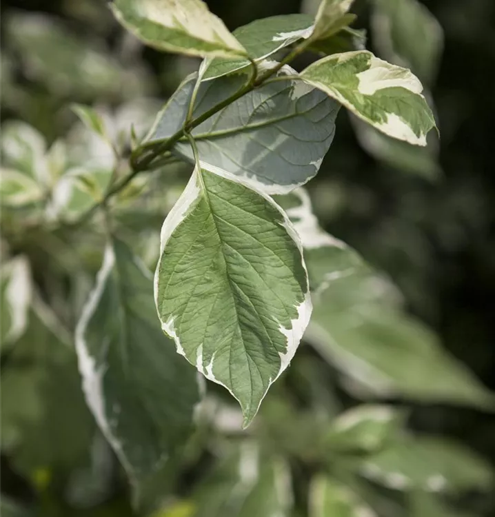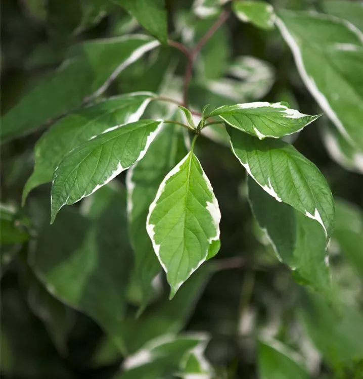 Hoher Blattschmuckwert. Die sommergrünen Blätter des Hartriegels 'Elegantissima' sind dunkelgrün, eiförmig, gegenständig, ganzrandig und weisen einen weißen Rand auf. Diese sind etwa 4 - 8 cm groß. Hartriegel 'Elegantissima' zeigt sich leuchtend karminrot im Herbst.