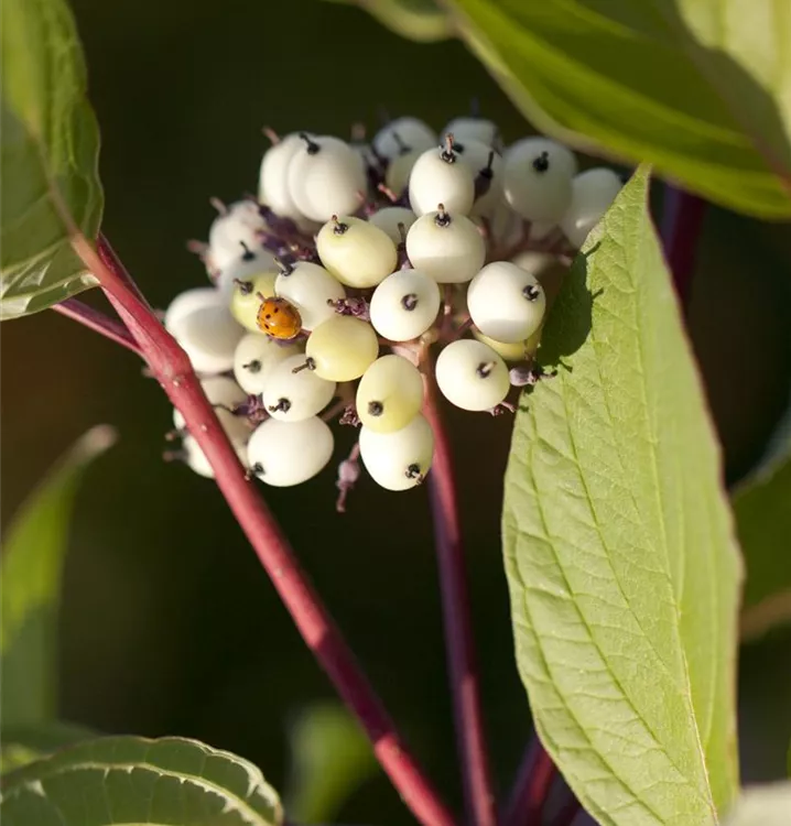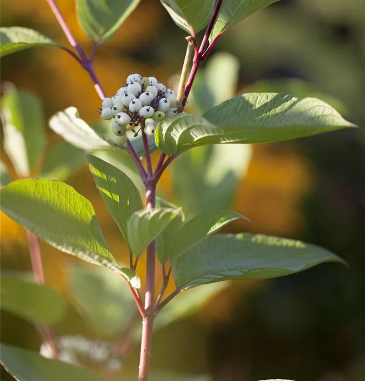 Besonders dekorativ sind die weiß-blauen, runden Beeren von Cornus alba 'Sibirica'. Diese erscheinen ab September.
