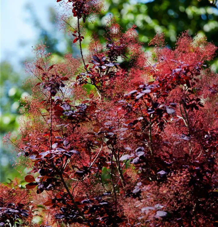 Der Rote Perückenstrauch 'Royal Purple' (Cotinus coggygria) ist ein buschiger, ausladender, breiter Strauch mit dekorativen, silbergrauen Früchten. Die rot-braunen, in Rispen angeordneten Blüten erscheinen von Juni bis Juli.