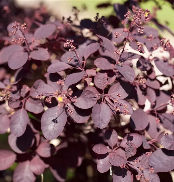 Die rot-braunen Blüten des Roten Perückenstrauch 'Royal Purple' erscheinen in Rispen von Juni bis Juli. Diese werden etwa 15 - 20 cm groß.