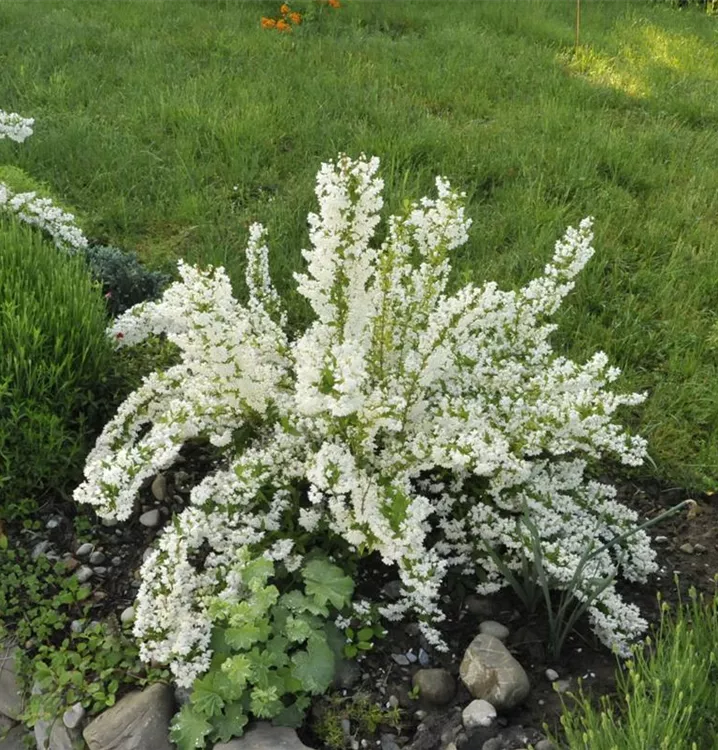 Der Maiblumenstrauch (Deutzia gracilis) ein buschiger, aufrechter, dichter Kleinstrauch, der, je nach Sorte, glockenförmige Blüten in verschiedenen Farben hervorbringt. An einem sonnigen Standort mit durchlässigem, nährstoffreichem Boden erreicht er gewöhnlich eine Höhe von ca. 80 cm und wird ca. 1 m breit.
