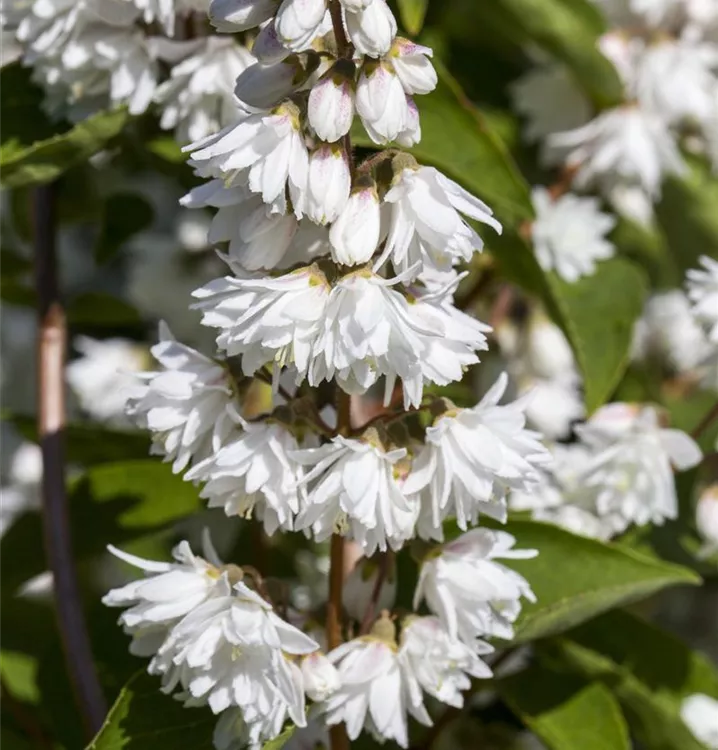 Der Gefüllte Sternchenstrauch 'Plena' (Deutzia scabra) ist ein aufrechter Strauch, der weiße, in Rispen angeordnete Blüten hervorbringt. Sie erscheinen von Juni bis Juli. An einem sonnigen bis halbschattigen Standort mit durchlässigem, nährstoffreichem Boden erreicht er gewöhnlich eine Höhe von ca. 4 m und wird ca. 2,5 m breit.