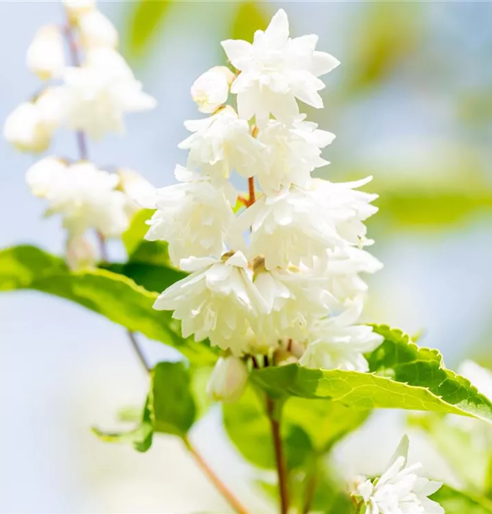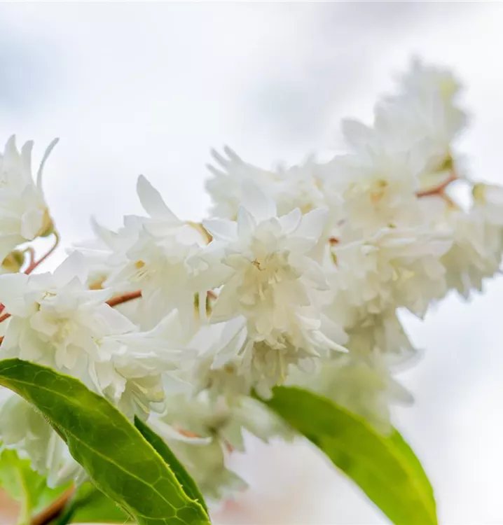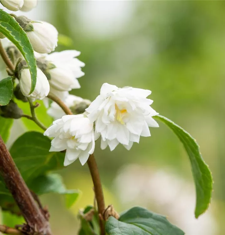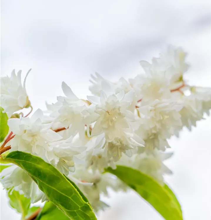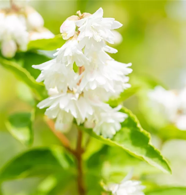 Die weißen, gefüllten Blüten des Gefüllten Sternchenstrauch 'Plena' erscheinen in Rispen von Juni bis Juli. Diese werden etwa 1 - 2 cm groß.