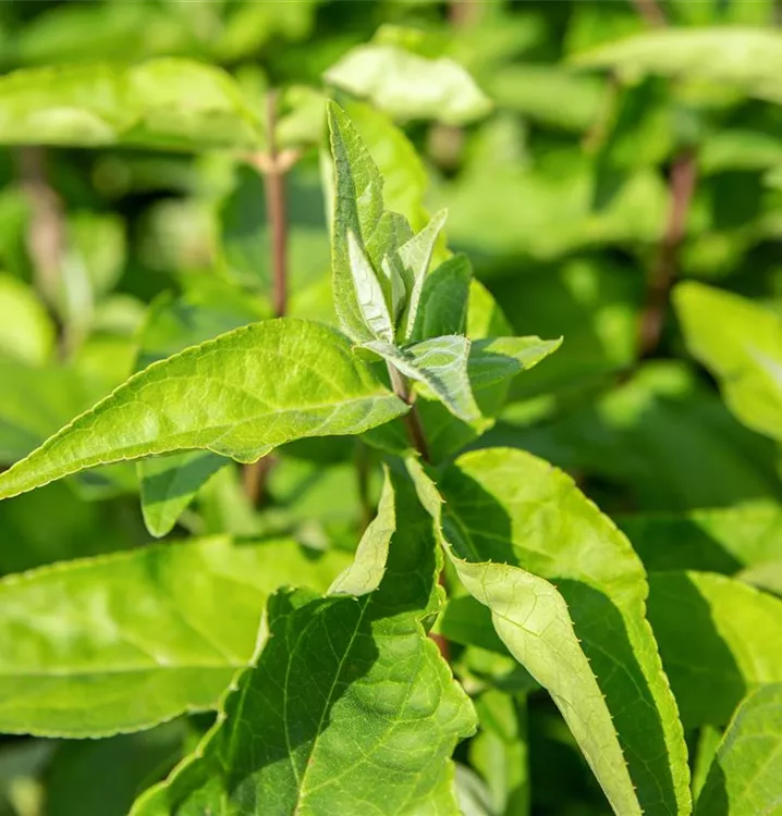 Die sommergrünen Blätter des Gefüllten Sternchenstrauchs 'Plena' sind dunkelgrün, lanzettlich. Diese sind etwa 5 - 10 cm groß.