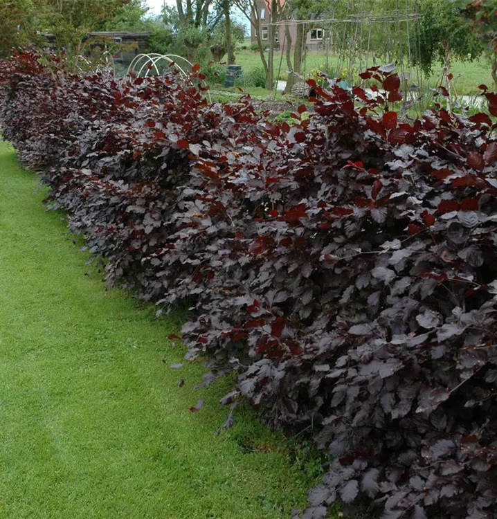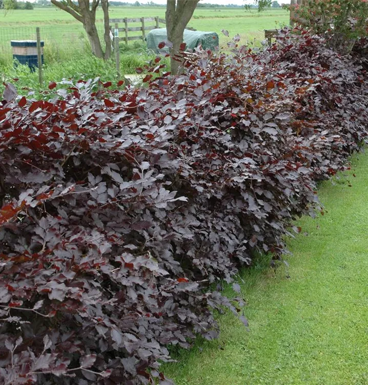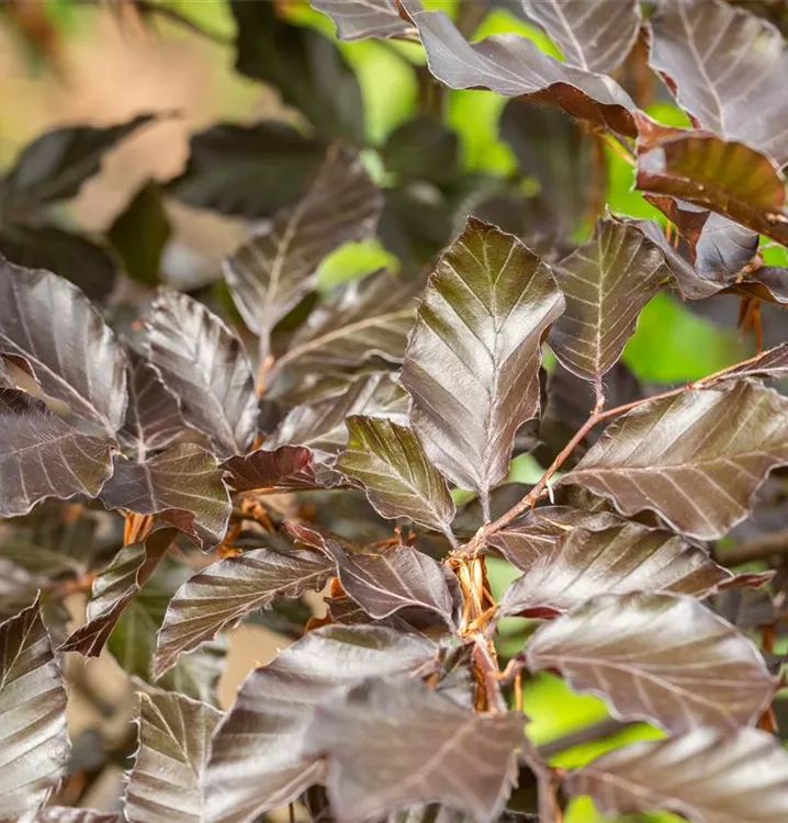 Die Blutbuche (Fagus sylvatica) ist ein aufrechter, breiter, Großbaum mit dekorativen sommergrünen, eiförmigen, schwarz-roten Blättern. Auch der dunkelrote Austrieb ist sehr schön.