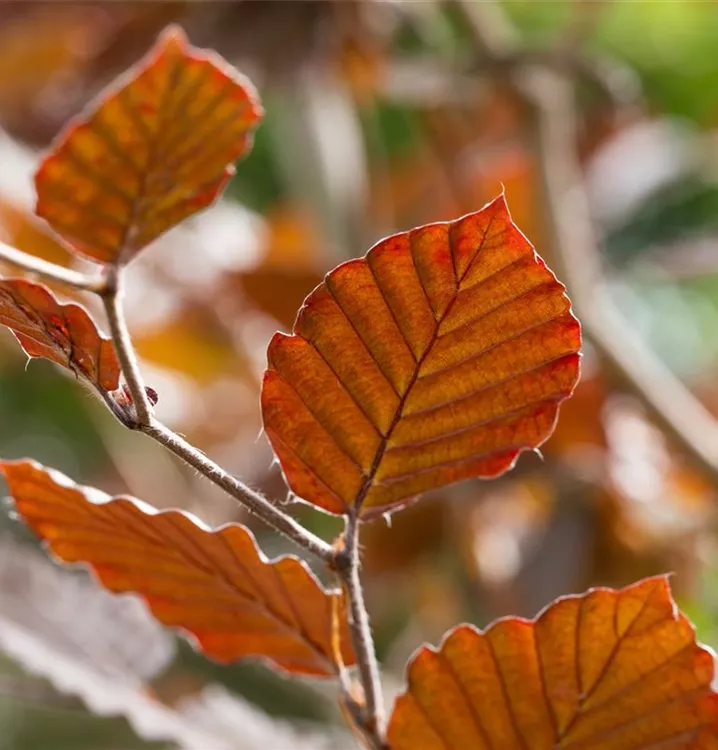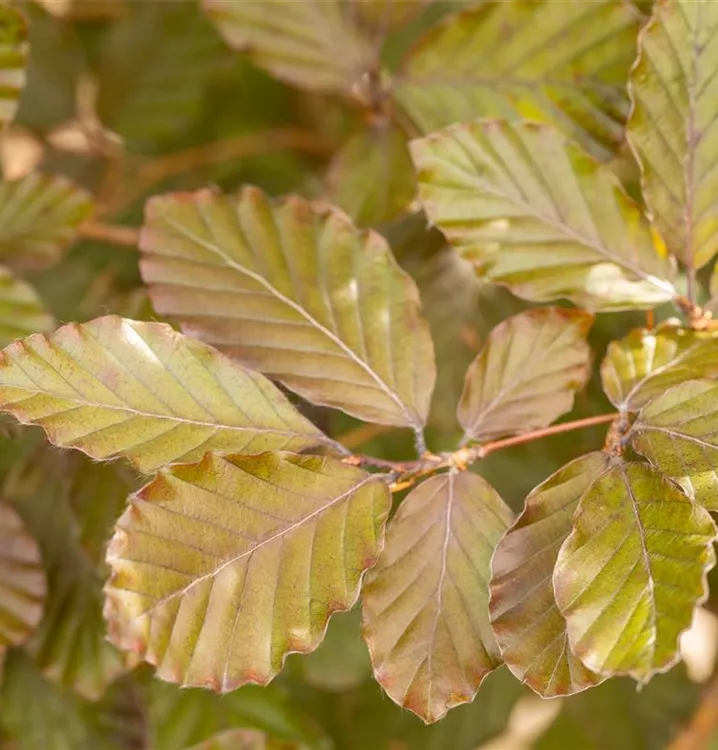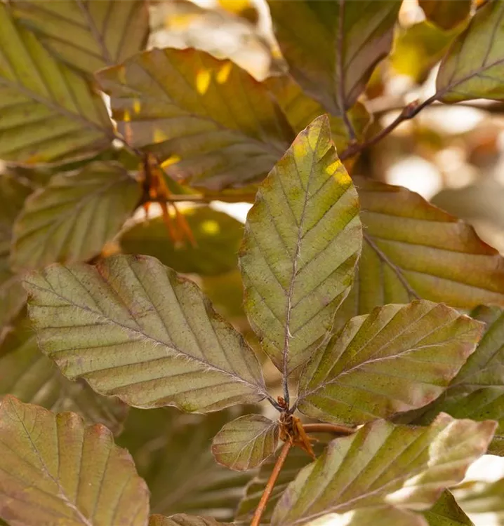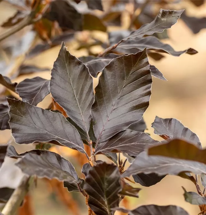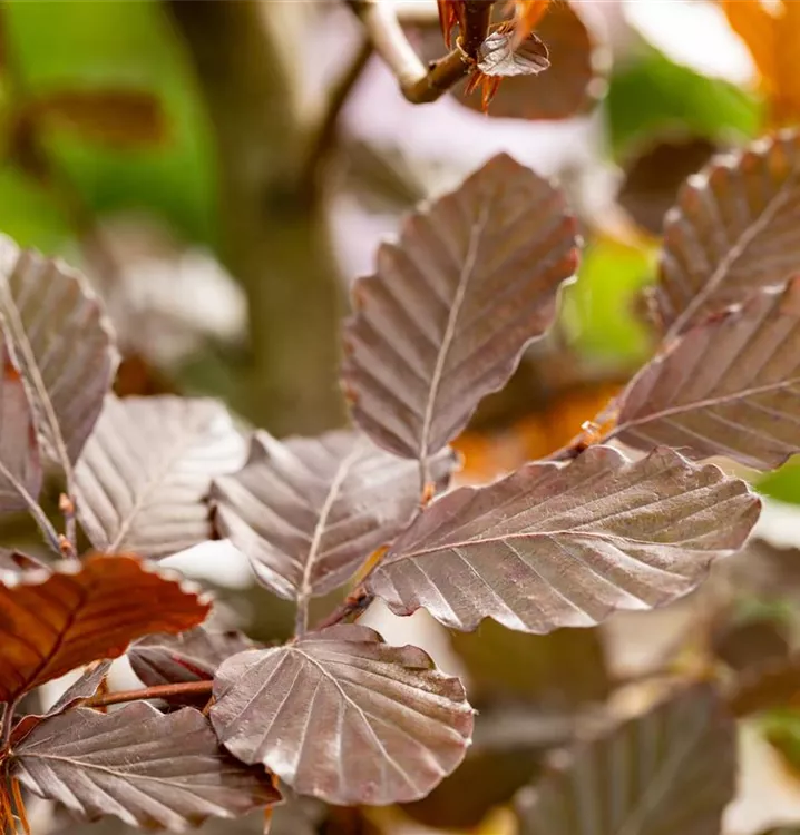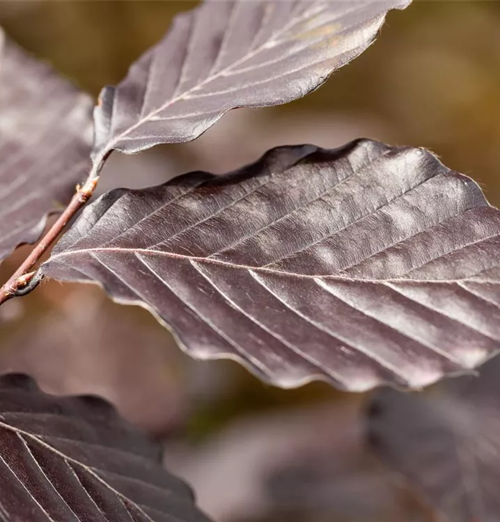 Hoher Blattschmuckwert. Die sommergrünen Blätter der Blutbuche sind schwarz-rot, eiförmig, wechselständig, gewellt. Diese sind etwa 5 - 10 cm groß. Dunkelroter Austrieb. Blutbuche zeigt sich leuchtend rot-braun im Herbst.