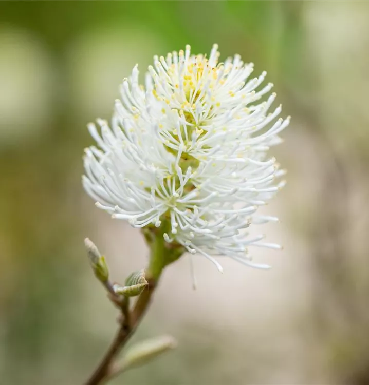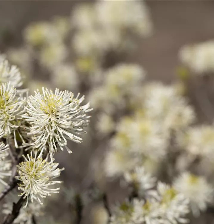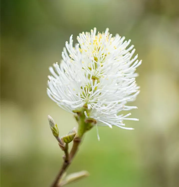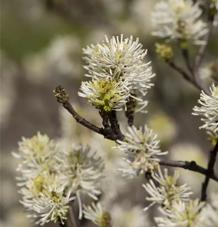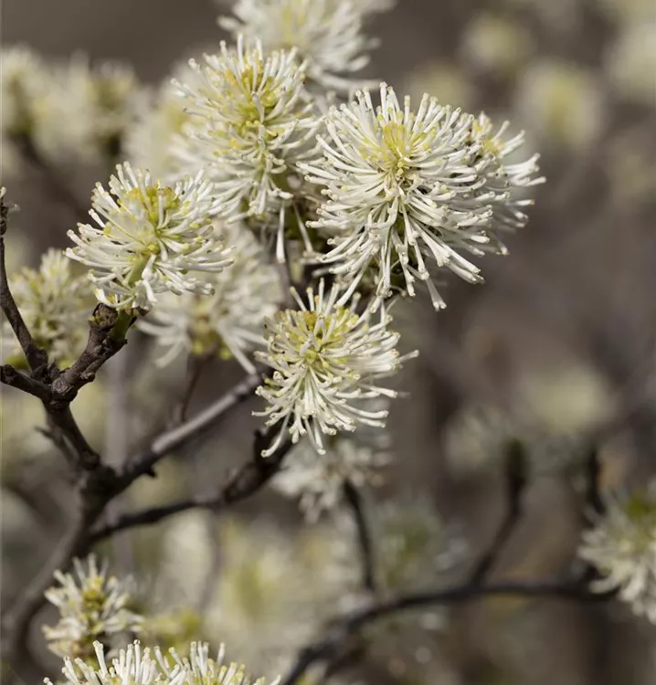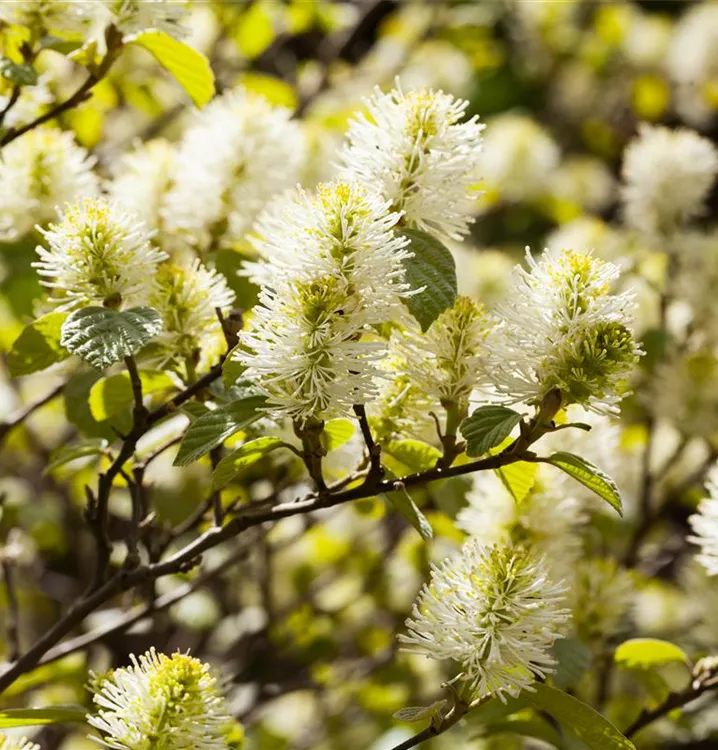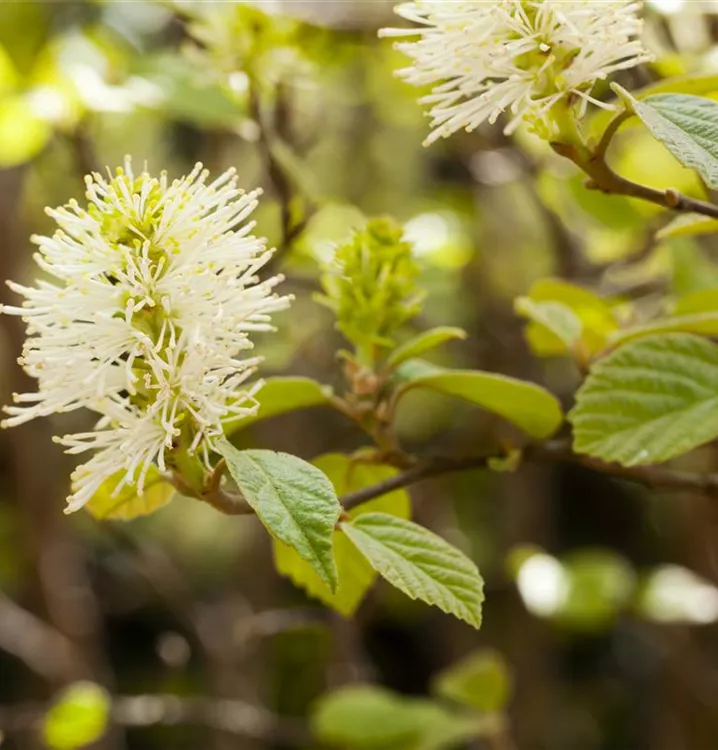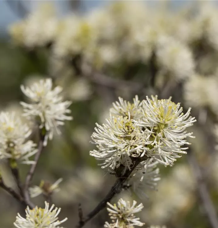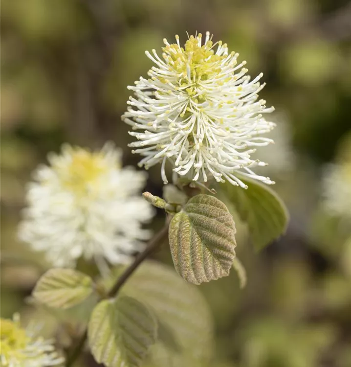 Der Große Federbuschstrauch (Fothergilla major) ein buschiger, aufrechter Strauch, der, je nach Sorte, Blüten in verschiedenen Farben hervorbringt. An einem sonnigen bis halbschattigen, windgeschützten Standort mit humosem, sandigem, saurem Boden erreicht er gewöhnlich eine Höhe von ca. 3 m und wird ca. 2 m breit.