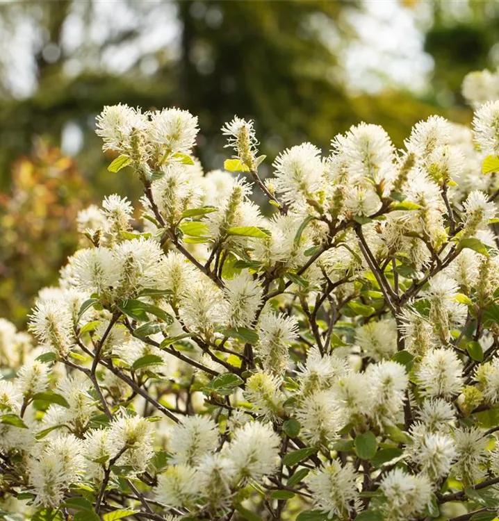 Die weißen Blüten des Großen Federbuschstrauch erscheinen in Ähren im Mai. Diese werden etwa 2 - 5 cm groß und sind stark duftend.