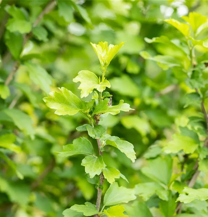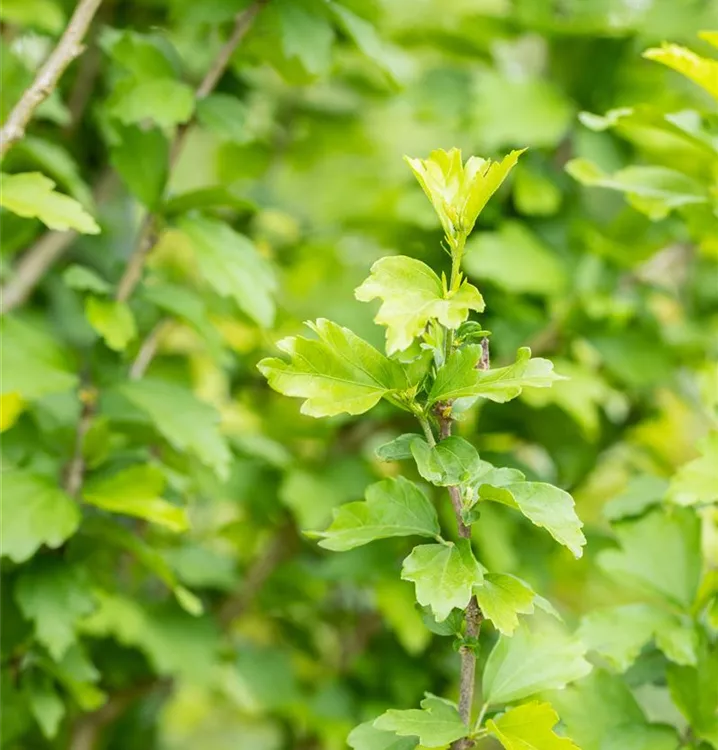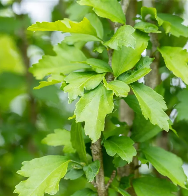 Die sommergrünen Blätter des Garteneibischs 'White Chiffon'® sind mittelgrün, eiförmig, wechselständig, gelappt.