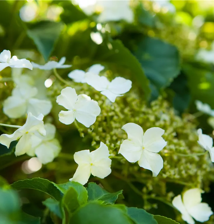 Die Kletterhortensie (Hydrangea petiolaris) ist eine kletternde sommergrüne Pflanze, die weiße, in Rispen angeordnete Blüten mit einem angenehmen Duft hervorbringt. Sie erscheinen von Juni bis Juli. Zudem trägt die Kletterhortensie, glänzende, eiförmige, dunkelgrüne Blätter. An einem sonnigen bis halbschattigen Standort mit durchlässigem, lockerem, saurem Boden erreicht sie gewöhnlich eine Höhe von ca. 12 m und wird ca. 4 m breit.