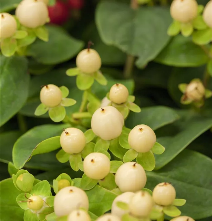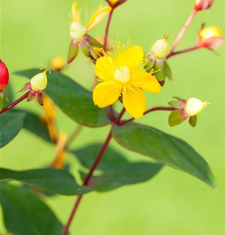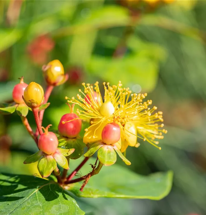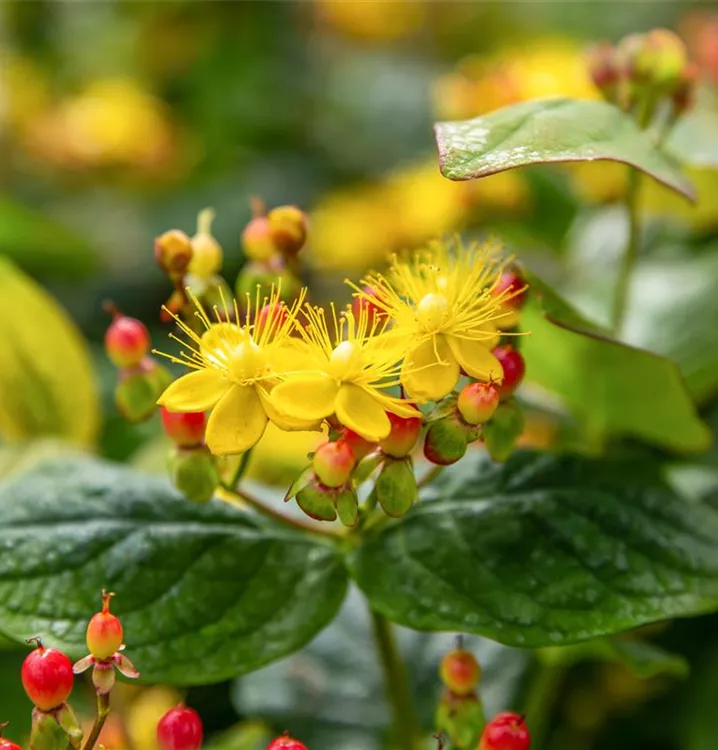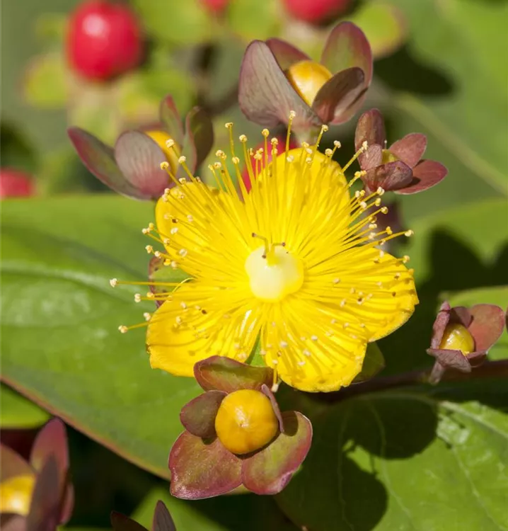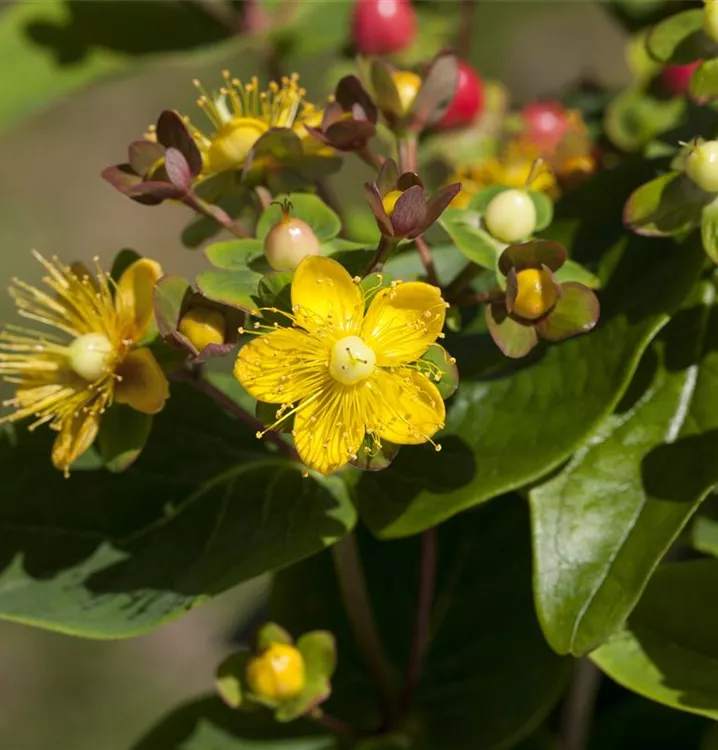 Das Johanniskraut (Hypericum inodorum) ist ein kompakter Kleinstrauch mit dekorativen, roten Früchten. Die Blüten erscheinen je nach Sorte in verschiedenen Farben.