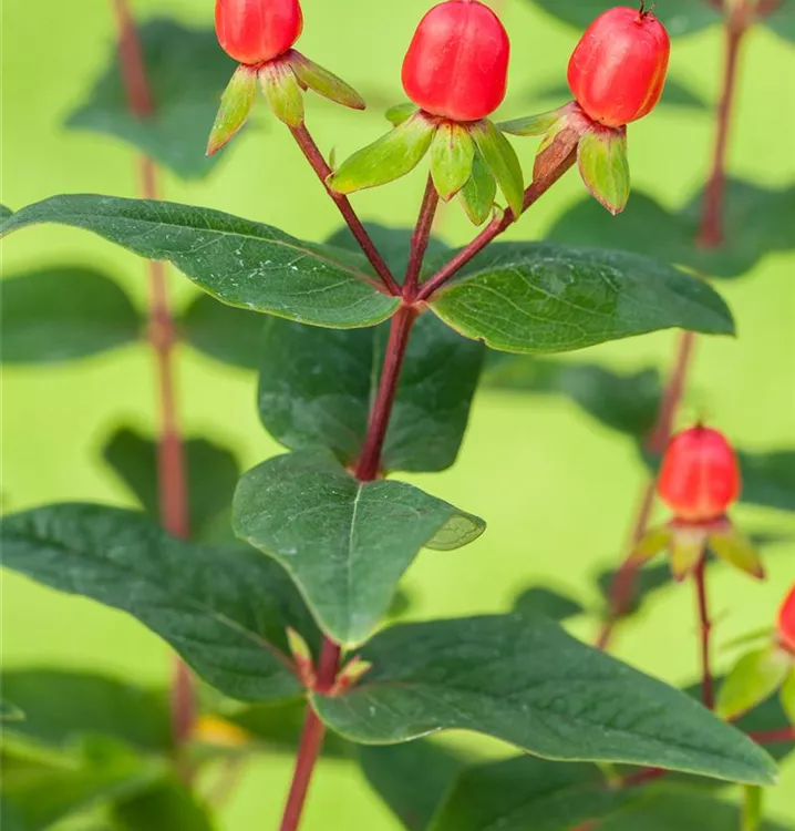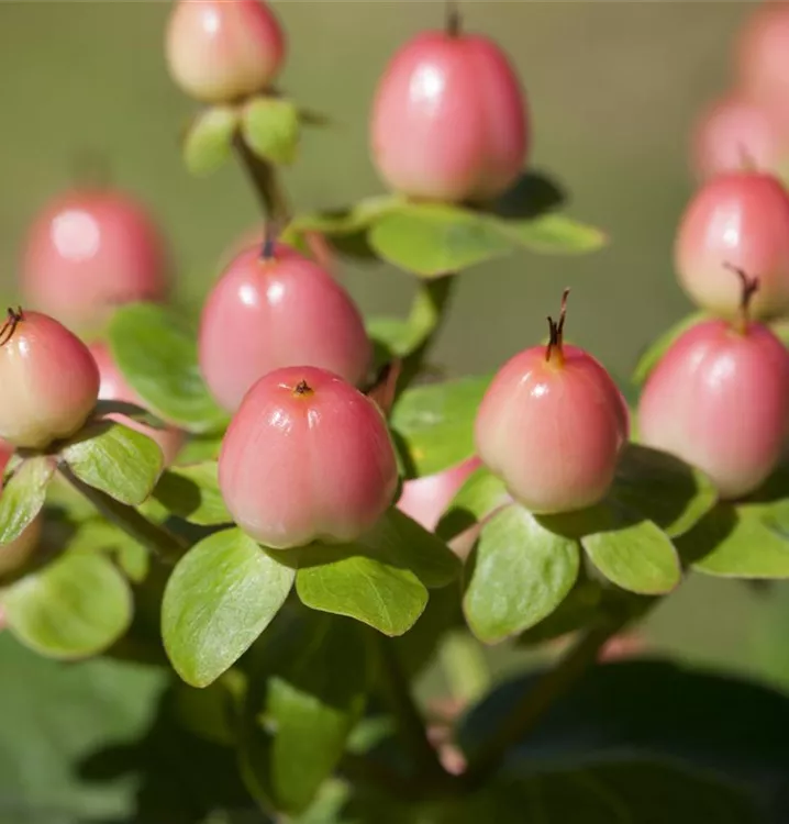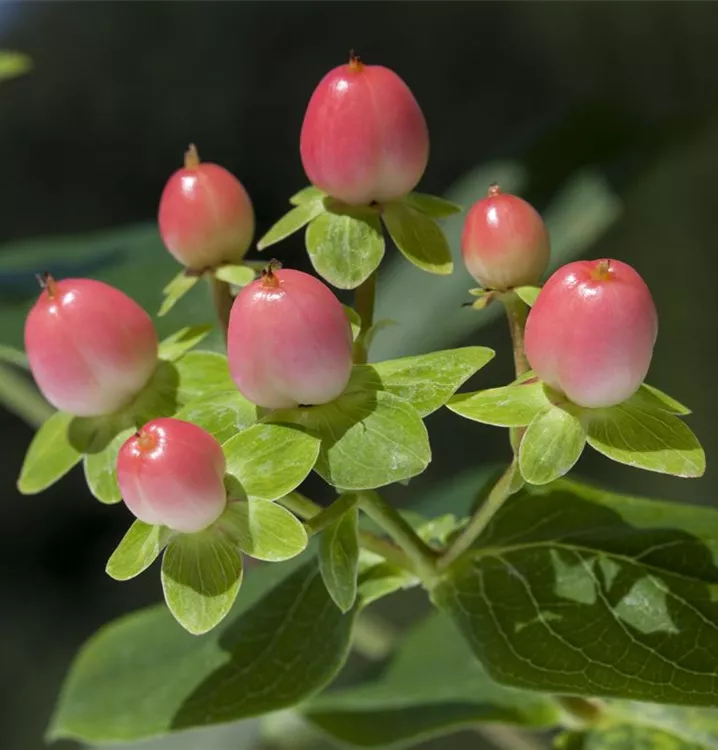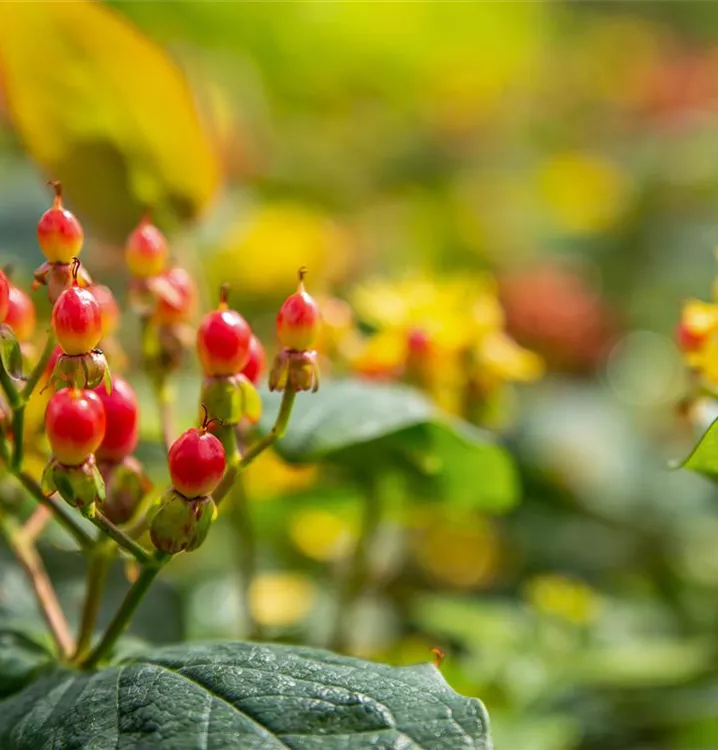 Besonders dekorativ sind die roten Früchte von Hypericum inodorum. Diese erscheinen ab September.