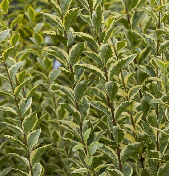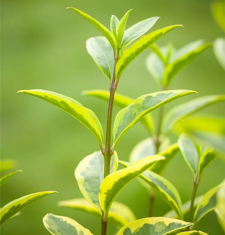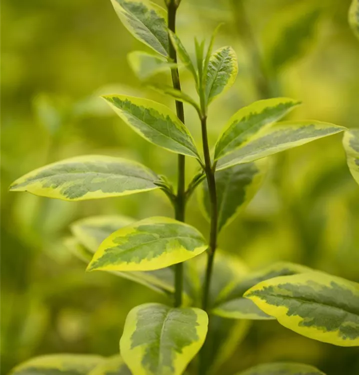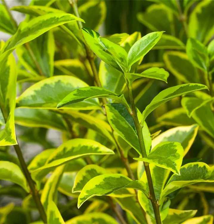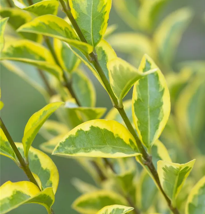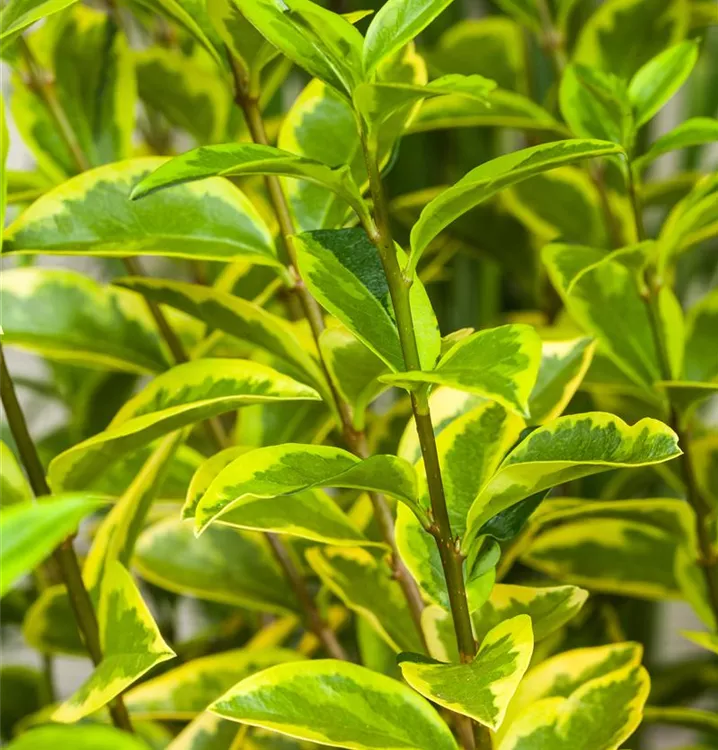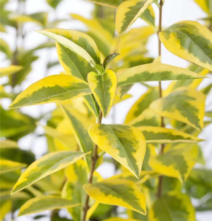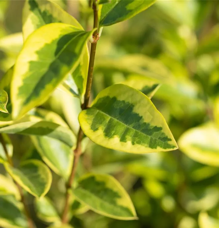 Der Goldliguster 'Aureum' (Ligustrum ovalifolium) ist ein aufrechter, straffer, Strauch mit dekorativen wintergrünen, glänzenden, eiförmigen, dunkelgrünen Blättern mit einem goldgelben Rand.