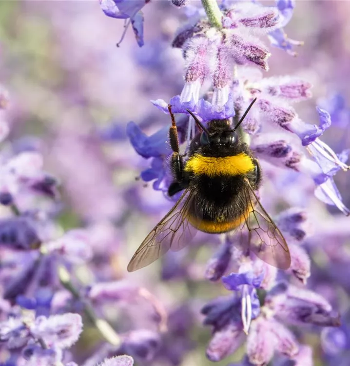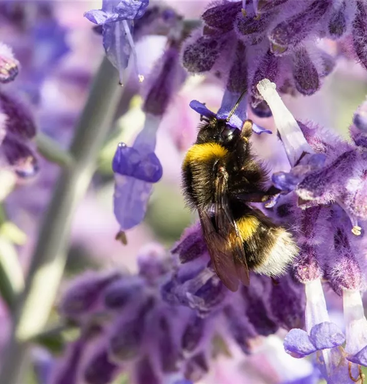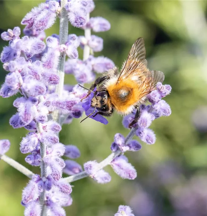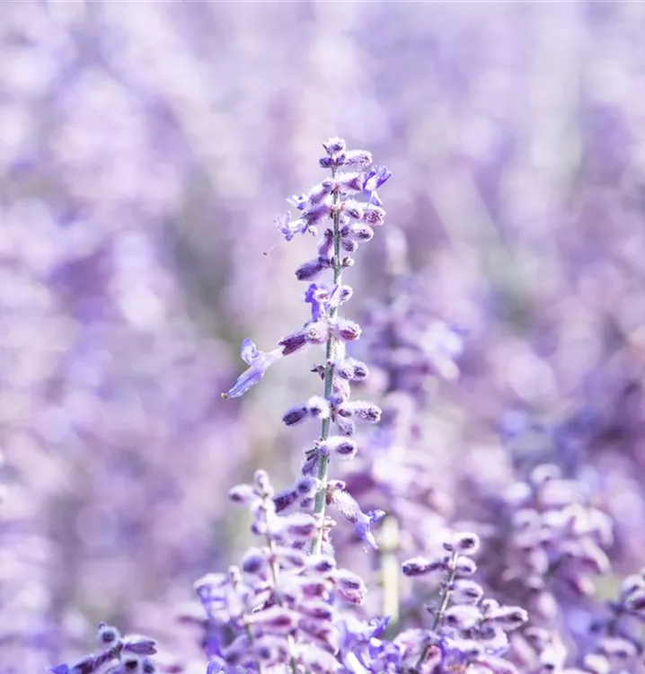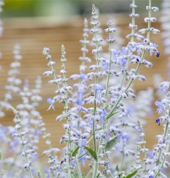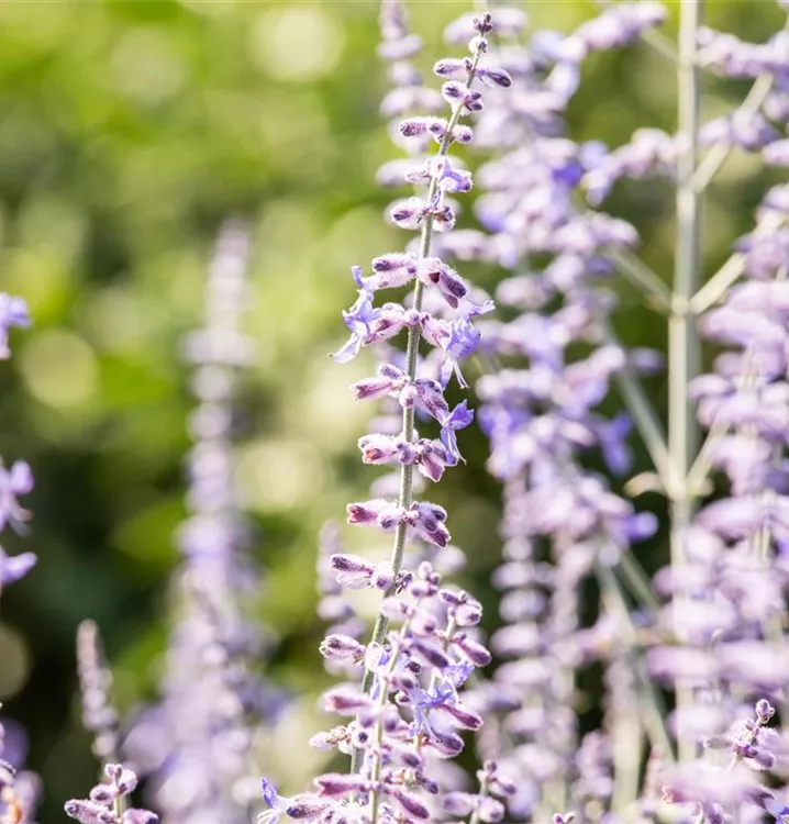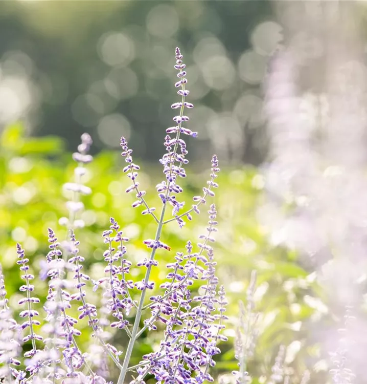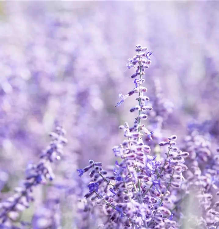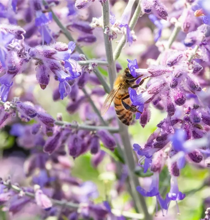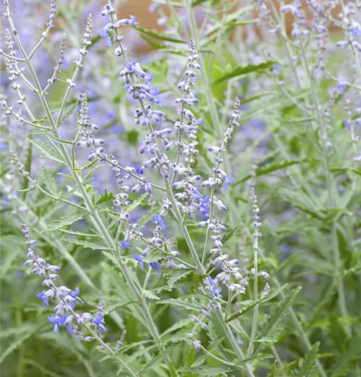 Die Blauraute 'Lacey Blue'® (Perovskia atriplicifolia) ist ein aufrechter, ausladender, feintriebiger, lockerer Kleinstrauch, der blaue Blüten mit einem angenehmen Duft hervorbringt. Sie erscheinen von Juli bis September. An einem sonnigen Standort mit durchlässigem, sandigem Boden erreicht sie gewöhnlich eine Höhe von ca. 1,5 m und wird ca. 1,5 m breit.
