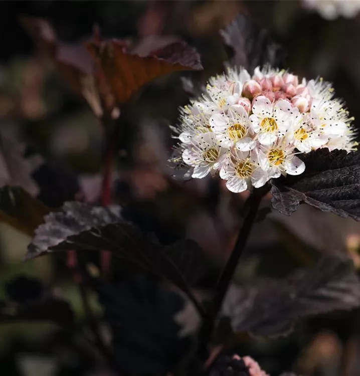 Die Fasanenspiere 'Diabolo'® (Physocarpus opulifolius) ist ein buschiger, aufrechter, Strauch mit dekorativen sommergrünen, eiförmigen, dunkelroten Blättern.