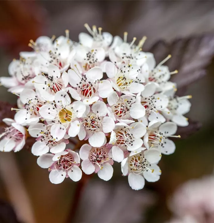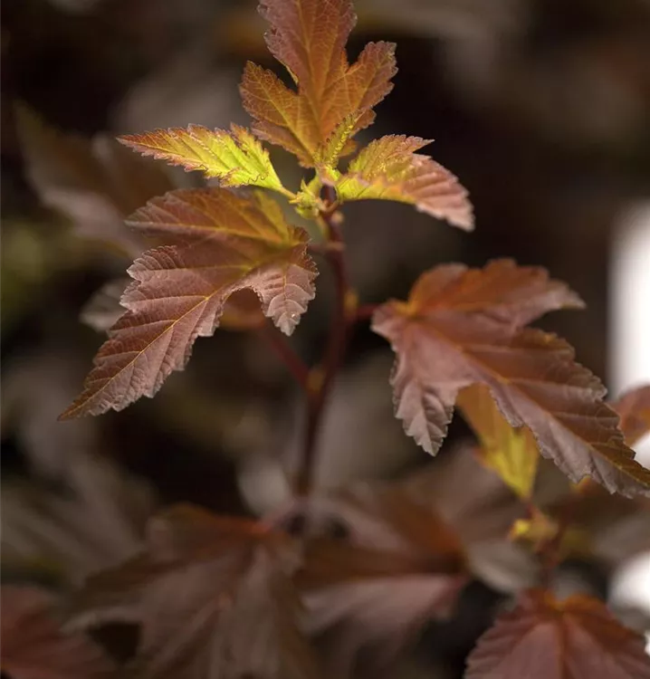 Die Fasanenspiere 'Diable d'Or'® (Physocarpus opulifolius) ist ein buschiger, aufrechter, Kleinstrauch mit dekorativen sommergrünen, eiförmigen, purpurroten Blättern. Auch der orange-rote Austrieb ist sehr schön.