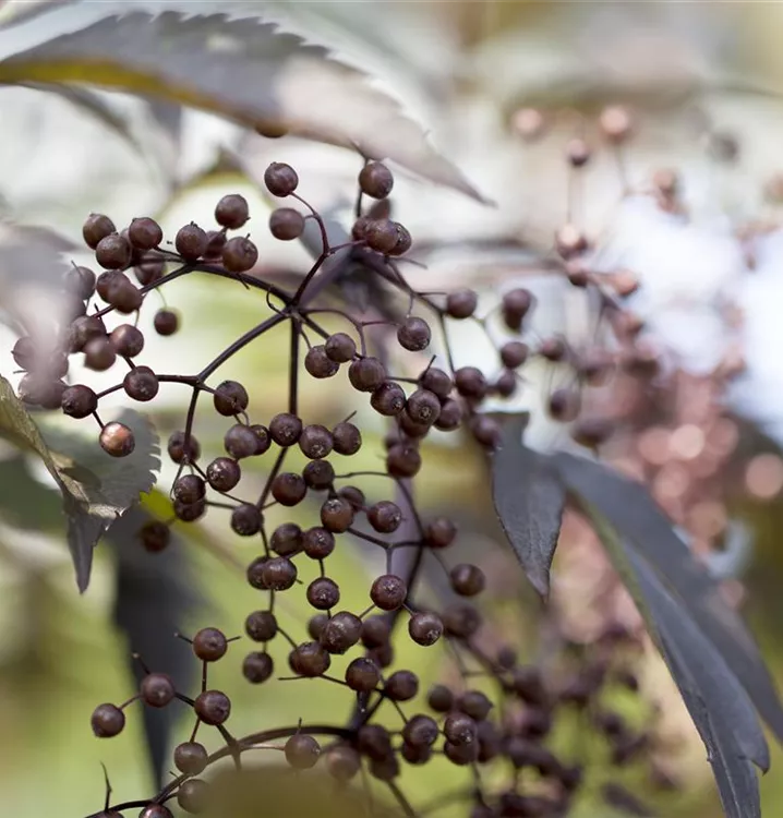 Hoher Blattschmuckwert. Die sommergrünen Blätter des Schwarzen Holunders 'Black Lace'(s) sind schwarz-blau, gefiedert, gegenständig, zerschlitzt. Schwarzer Holunder 'Black Lace'(s) zeigt sich leuchtend gelb im Herbst. Lange haftend.