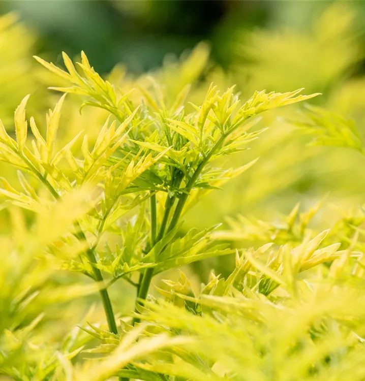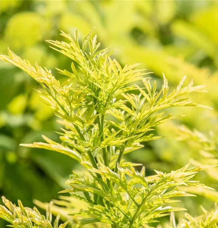 Die sommergrünen Blätter des Schwarzen Holunders 'Golden Tower' sind grüngelb, gefiedert, gegenständig.