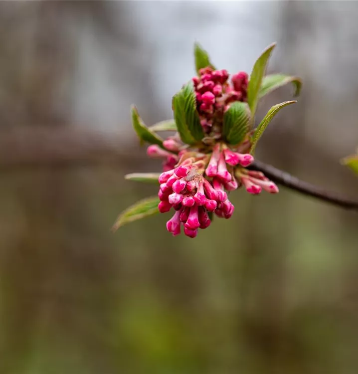 Die rosafarbenen Blüten des Winterschneeball 'Dawn' erscheinen in Rispen von November bis April. Diese sind stark duftend.