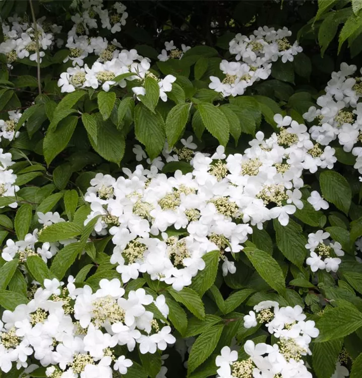 Der Japanische Schneeball 'Summer Snowflake' (Viburnum plicatum) ist ein rundlicher Strauch, der weiße, in Trugdolden angeordnete Blüten mit einem starken Duft hervorbringt. Sie erscheinen von Mai bis Juni. Seine Rinde ist dunkelgrau. An einem sonnigen bis halbschattigen Standort mit durchlässigem, humosem, lockerem Boden erreicht er gewöhnlich eine Höhe von ca. 3 m und wird ca. 3 m breit.