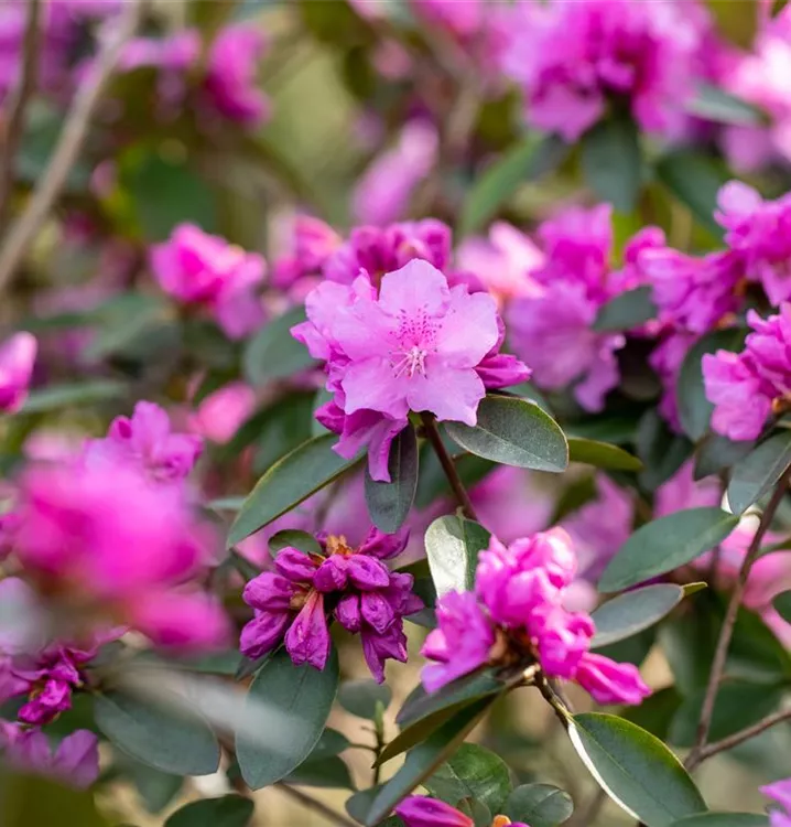 Der Karolina-Rhododendron 'P.J.M. Elite' (Rhododendron carolinianum) bringt von Ende April bis Mitte Mai ein wahres Meer aus rosaroten Blüten hervor. Dieses aufrecht, buschig, kompakt wachsende Gehölz erreicht gewöhnlich eine Höhe von 80 - 90 cm und eine Breite von 0,9 bis 1 m. Ein halbschattiger (bis schattiger) Standort und ein humoser, kalkfreier Boden schaffen optimale Bedingungen für ein gesundes Wachstum. Der Karolina-Rhododendron 'P.J.M. Elite' ist gut frostverträglich.