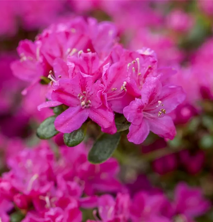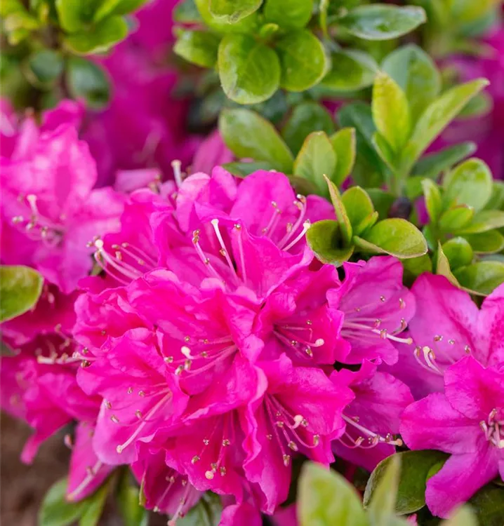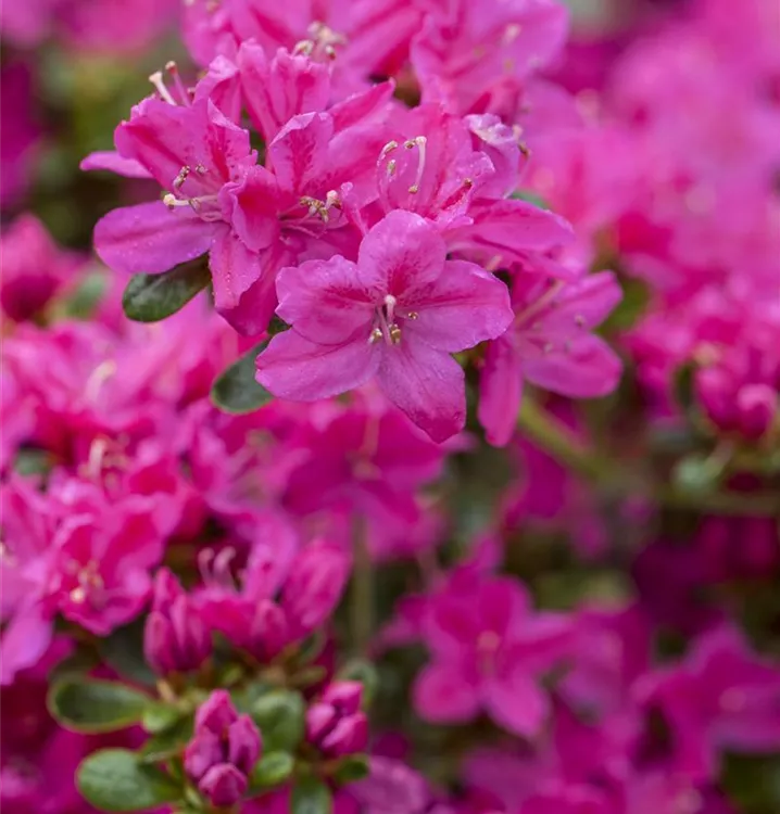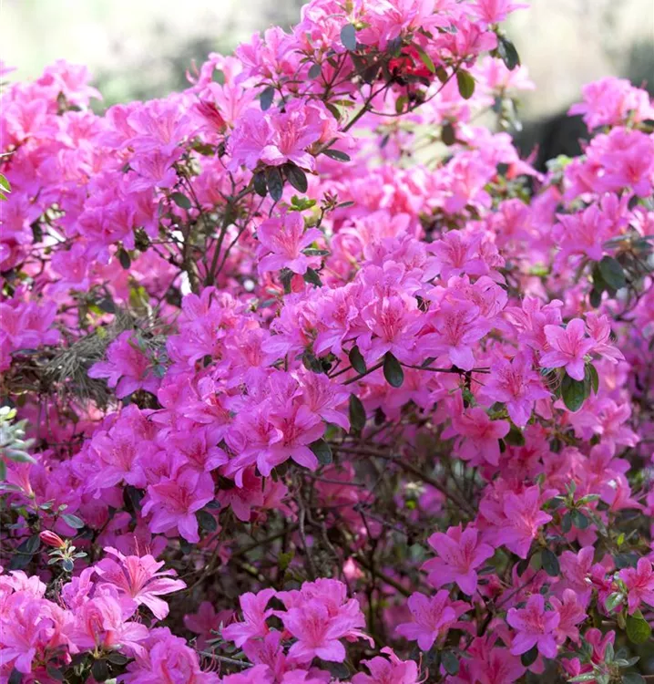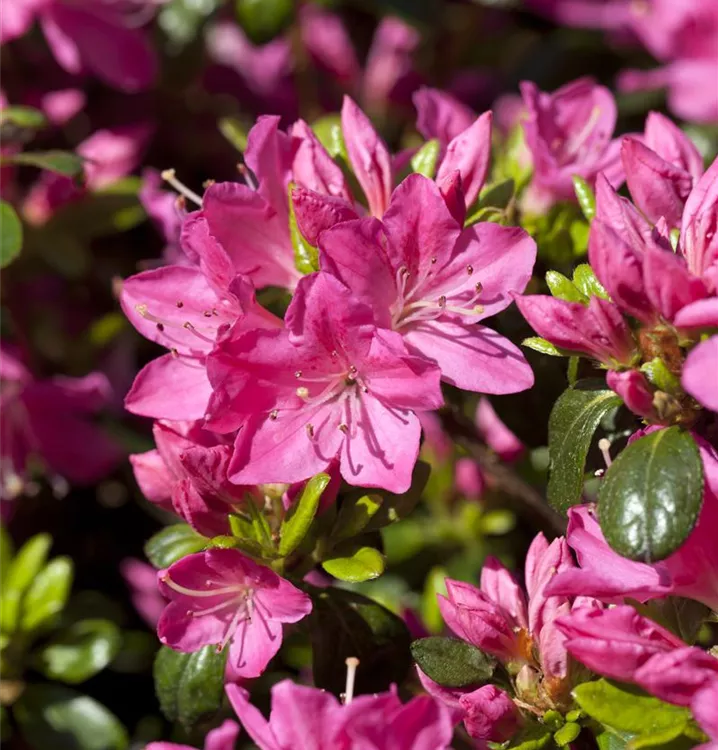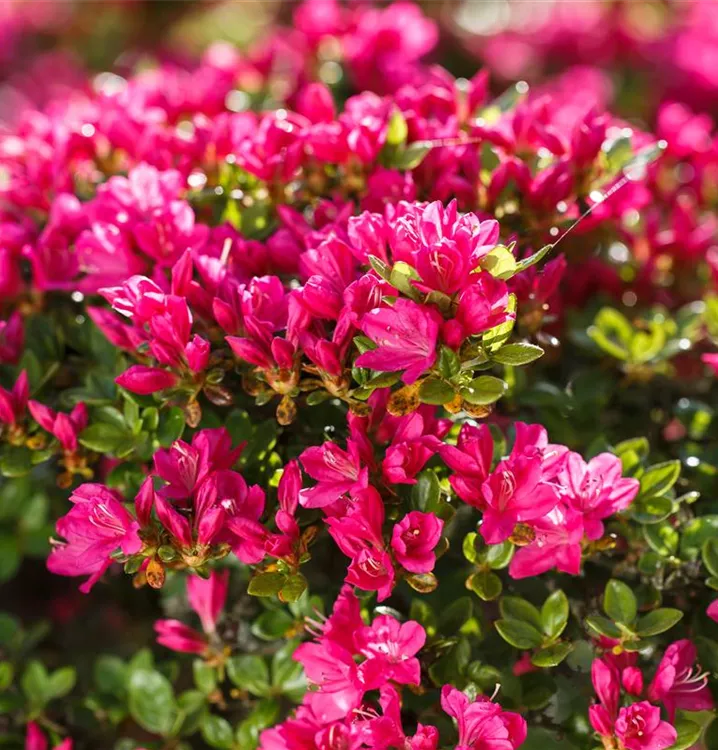 Die Japanische Azalee 'Kermesina' (Rhododendron obtusum) bringt von Mai bis Juni ein wahres Meer aus rosaroten Blüten hervor. Dieses dicht, kompakt wachsende Gehölz erreicht gewöhnlich eine Höhe von 40 - 60 cm und eine Breite von 60 bis 80 cm. Ein halbschattiger (bis schattiger) Standort und ein durchlässiger, nährstoffreicher, saurer Boden schaffen optimale Bedingungen für ein gesundes Wachstum. Die Japanische Azalee 'Kermesina' ist gut frostverträglich.