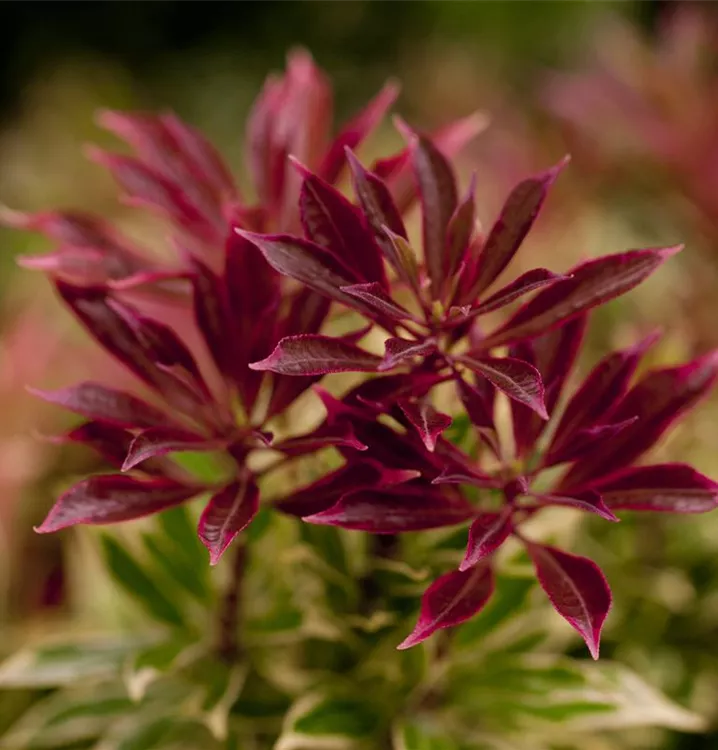 Das Schattenglöckchen 'Carnaval' (Pieris japonica) ist ein buschiger, kompakter, Kleinstrauch mit dekorativen immergrünen, glänzenden, lanzettlichen, dunkelgrünen Blättern mit einem cremeweißen Rand. Auch der rote Austrieb ist sehr schön.