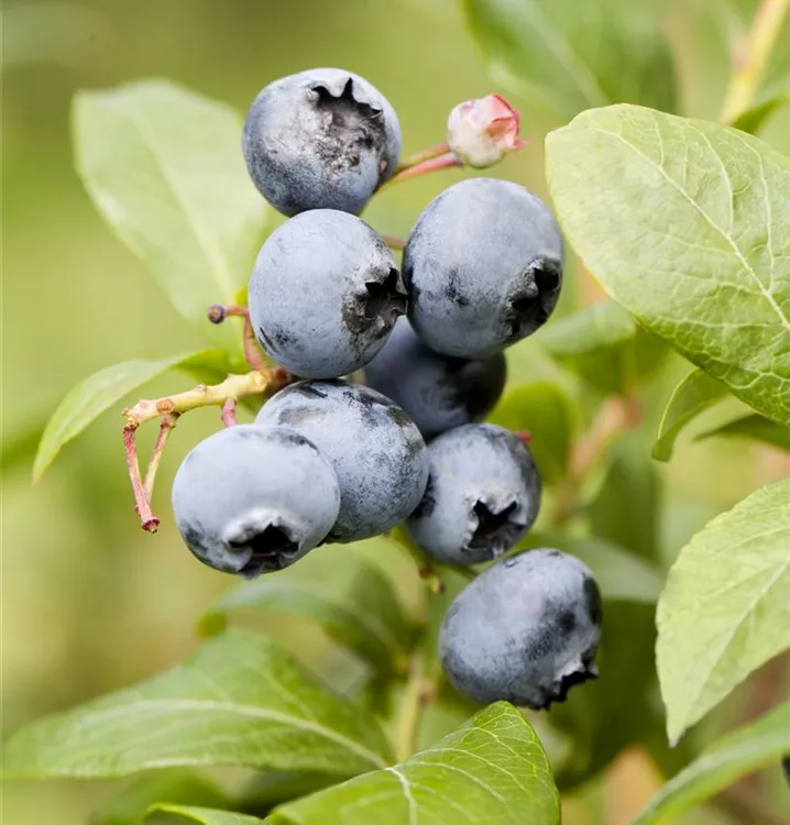 Die Heidelbeere 'Goldtraube' (Vaccinium corymbosum) bildet hellblaue, große Beeren. Diese sind fest und süß-säuerlich im Geschmack. Für eine ertragreiche Ernte ab August schaffen humoser, sandiger, feuchter bis nasser, schwachsaurer Boden und ein sonniger bis halbschattiger Standort optimale Bedingungen. Auch ihre hellrosafarbenen Blüten sind eine schöne Erscheinung.