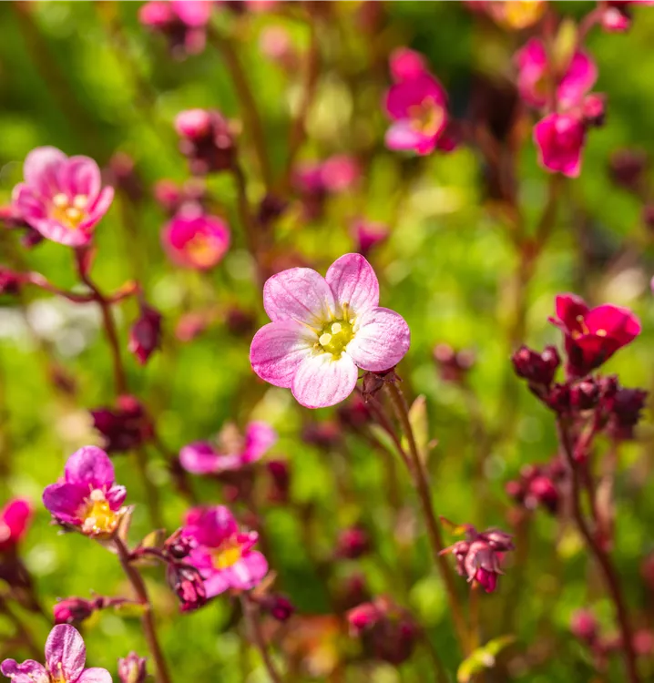Saxifraga x arendsii 'Blütenteppich' bildet schalenförmige, rosafarbene Blüten ab April.